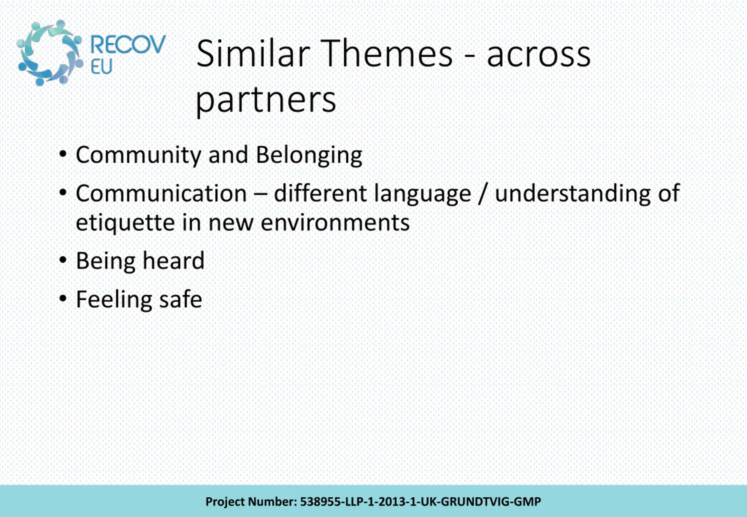 partners Similar Themes - across Community and Belonging Communication different language / understanding of etiquette in new environments Being heard Feeling safe Project Number: 538955-LLP-1-2013-1-UK-GRUNDTVIG-GMP