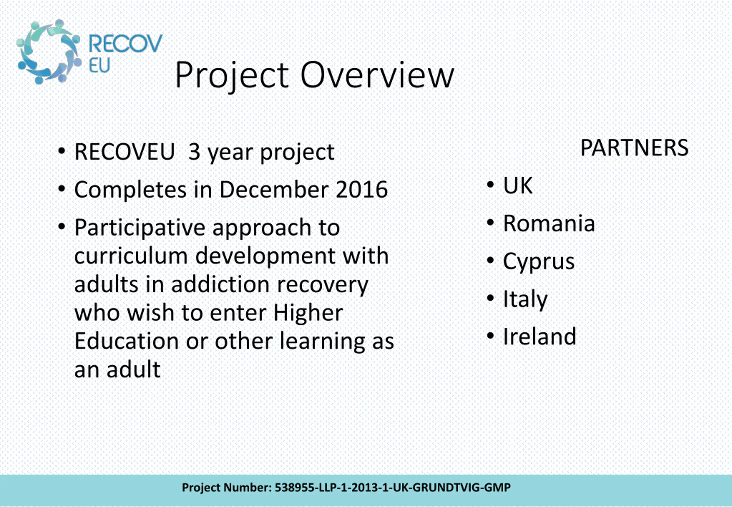 Project Overview RECOVEU 3 year project Completes in December 2016 Participative approach to curriculum development with adults in addiction recovery who wish to enter Higher Education or other learning as an adult PARTNERS UK Romania Cyprus Italy Ireland Project Number: 538955-LLP-1-2013-1-UK-GRUNDTVIG-GMP