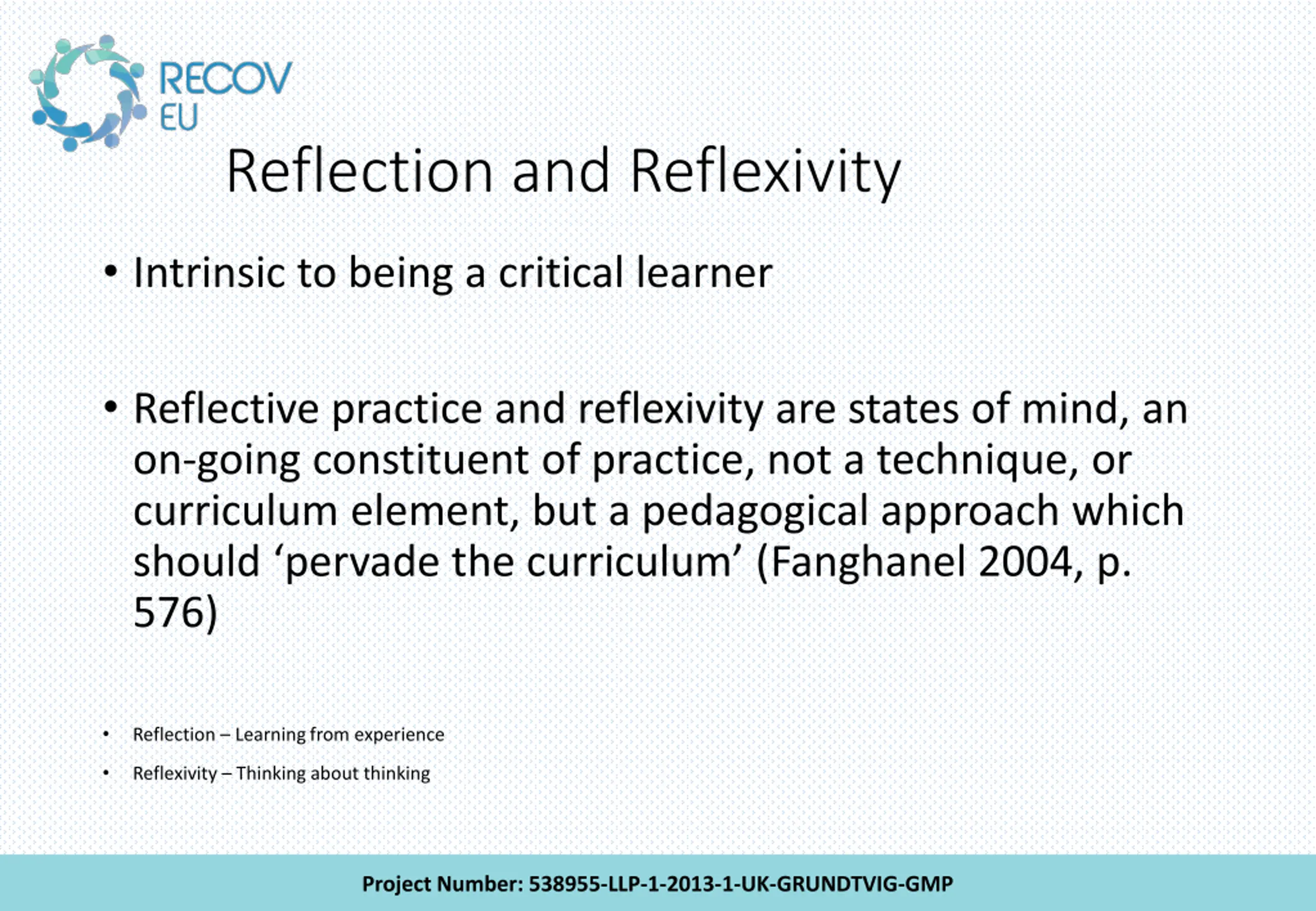 Reflection and Reflexivity Intrinsic to being a critical learner Reflective practice and reflexivity are states of mind, an on-going constituent of practice, not a technique, or curriculum element, but a pedagogical approach which should pervade the curriculum (Fanghanel 2004, p. 576) Reflection Learning from experience Reflexivity Thinking about thinking Project Number: 538955-LLP-1-2013-1-UK-GRUNDTVIG-GMP