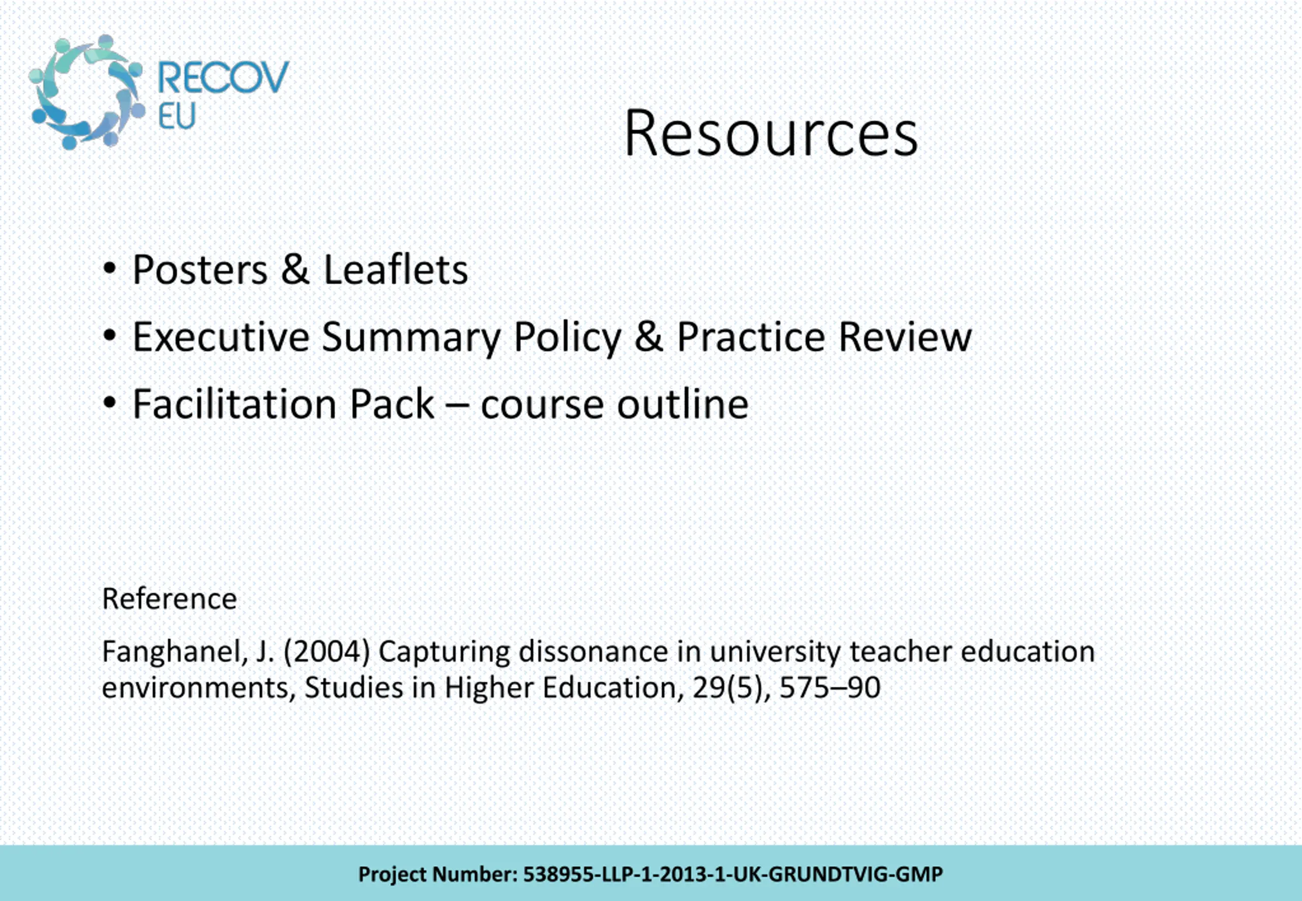 Resources Posters & Leaflets Executive Summary Policy & Practice Review Facilitation Pack course outline Reference Fanghanel, J. (2004) Capturing dissonance in university teacher education environments, Studies in Higher Education, 29(5), 575 90 Project Number: 538955-LLP-1-2013-1-UK-GRUNDTVIG-GMP