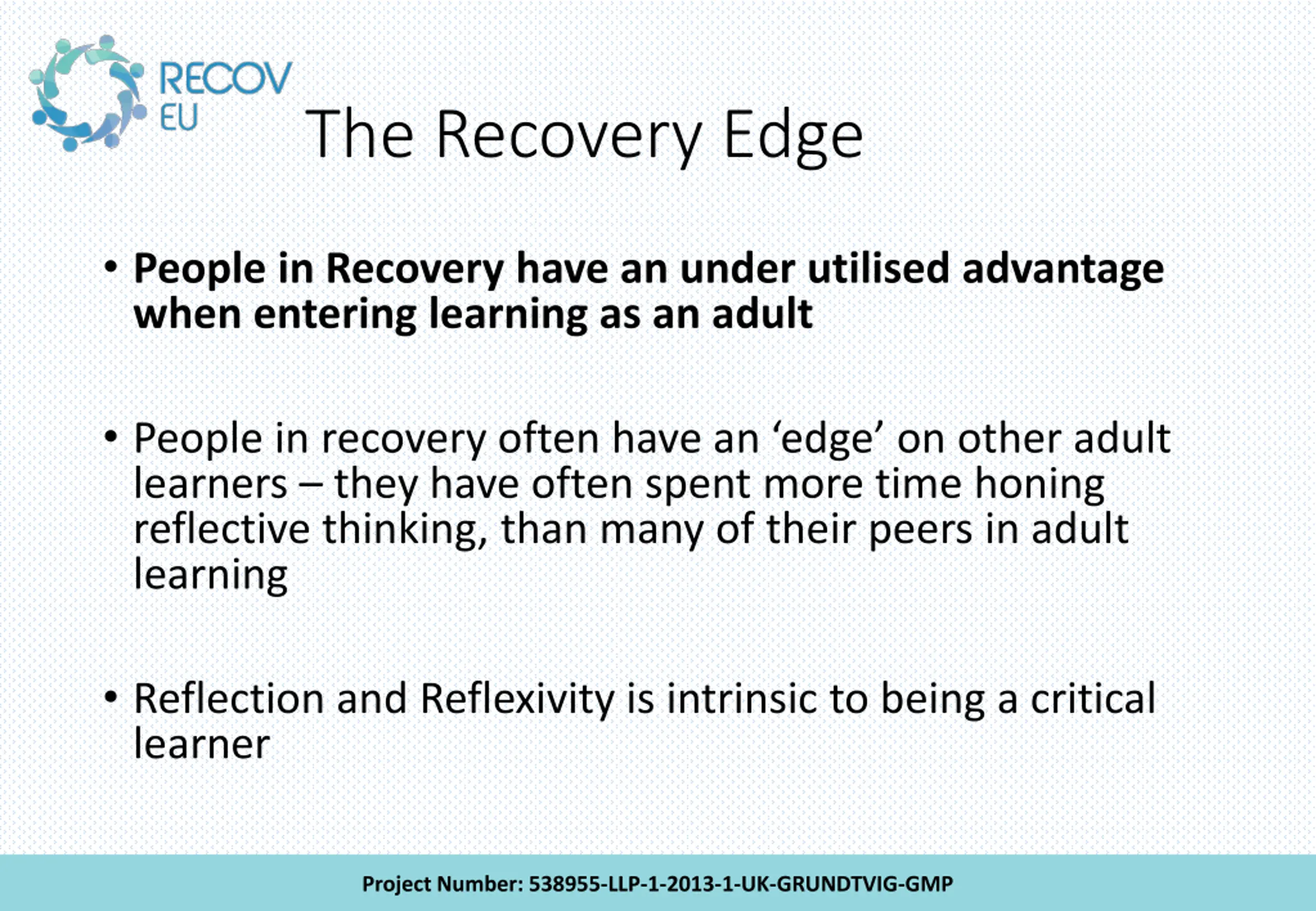 The Recovery Edge People in Recovery have an under utilised advantage when entering learning as an adult People in recovery often have an edge on other adult learners they have often spent more time honing reflective thinking, than many of their peers in adult learning Reflection and Reflexivity is intrinsic to being a critical learner Project Number: 538955-LLP-1-2013-1-UK-GRUNDTVIG-GMP