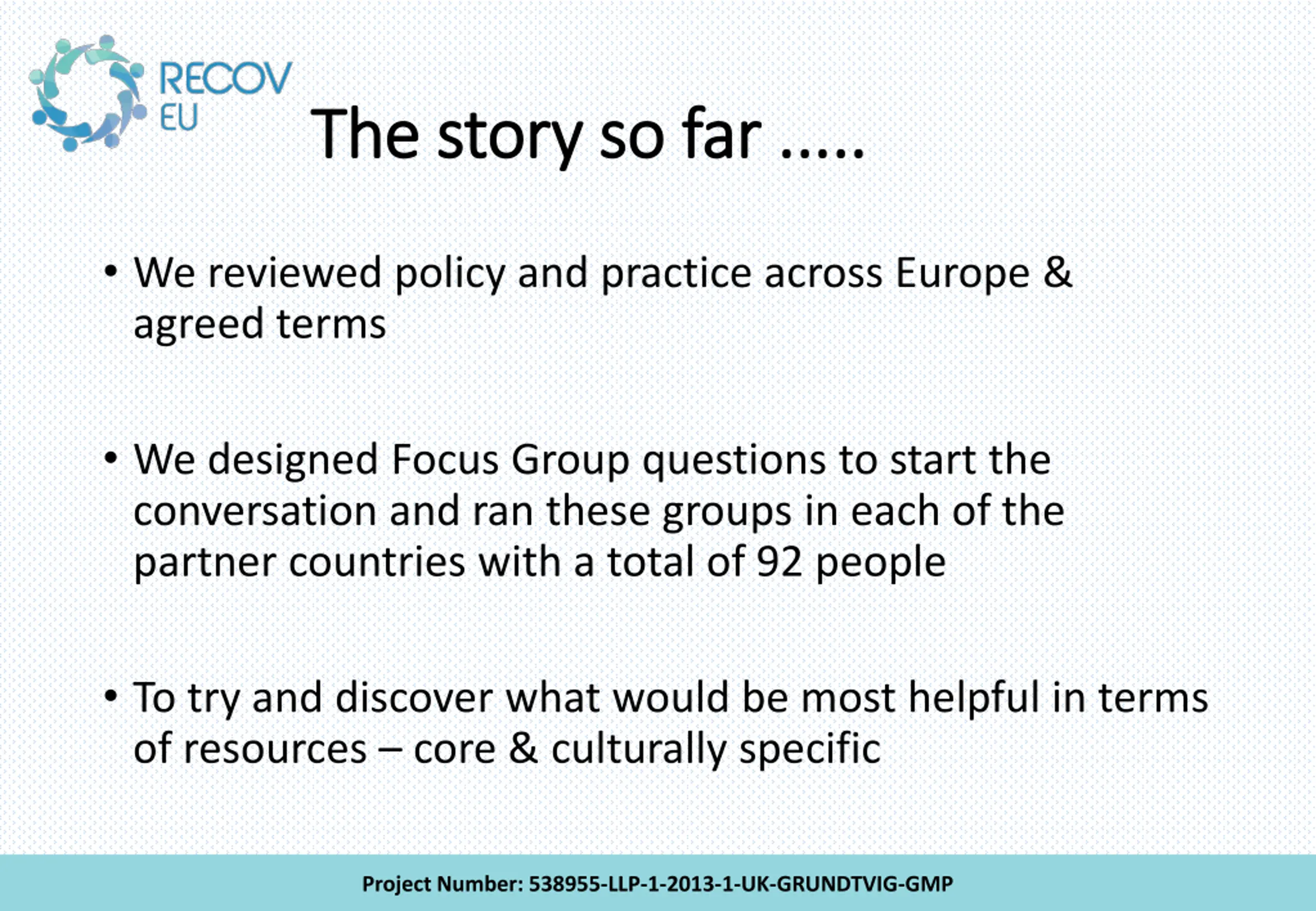 The story so far ..... The story so far ..... We reviewed policy and practice across Europe & agreed terms We designed Focus Group questions to start the conversation and ran these groups in each of the partner countries with a total of 92 people To try and discover what would be most helpful in terms of resources core & culturally specific Project Number: 538955-LLP-1-2013-1-UK-GRUNDTVIG-GMP