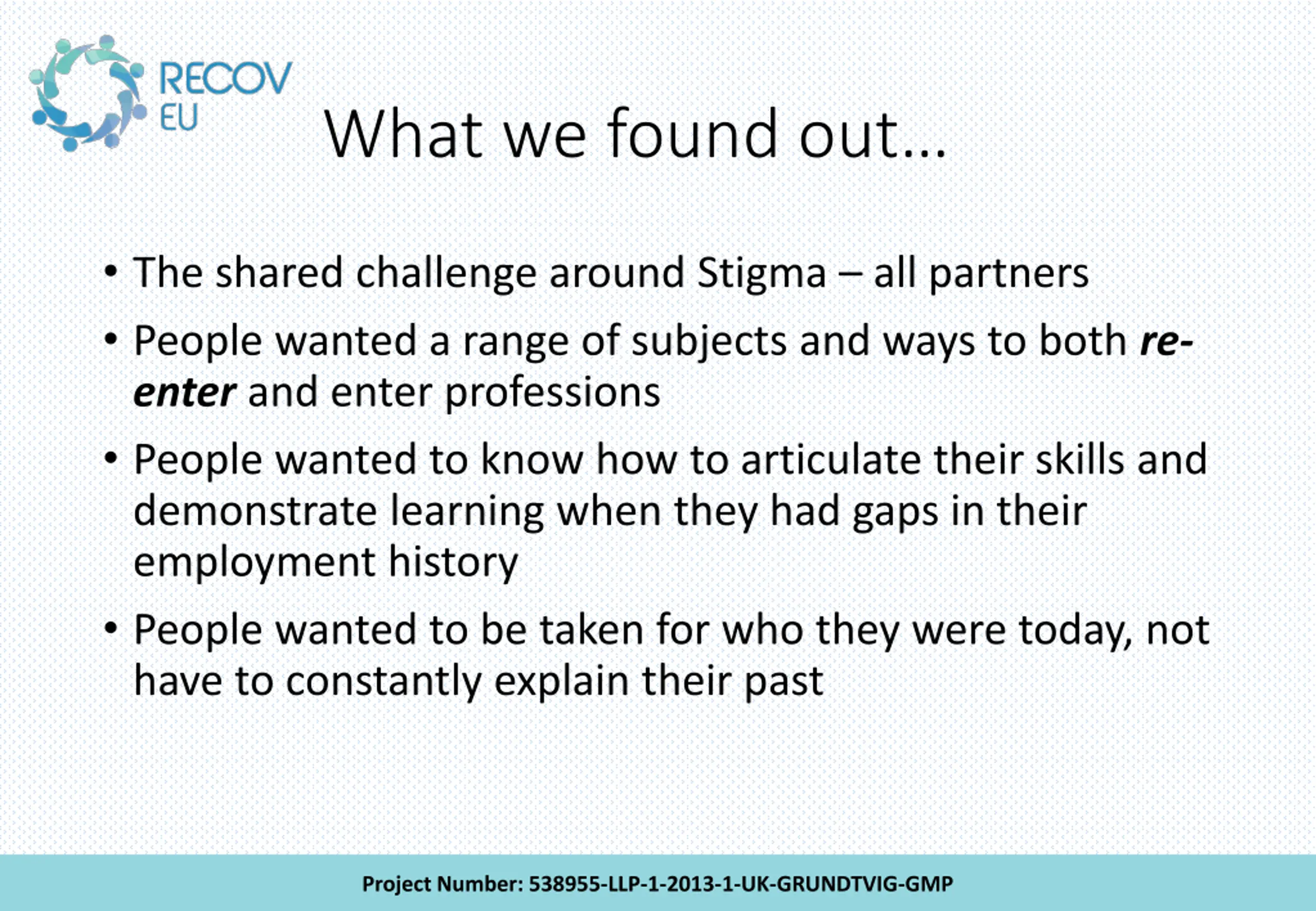 What we found out The shared challenge around Stigma all partners People wanted a range of subjects and ways to both re- enter and enter professions People wanted to know how to articulate their skills and demonstrate learning when they had gaps in their employment history People wanted to be taken for who they were today, not have to constantly explain their past Project Number: 538955-LLP-1-2013-1-UK-GRUNDTVIG-GMP