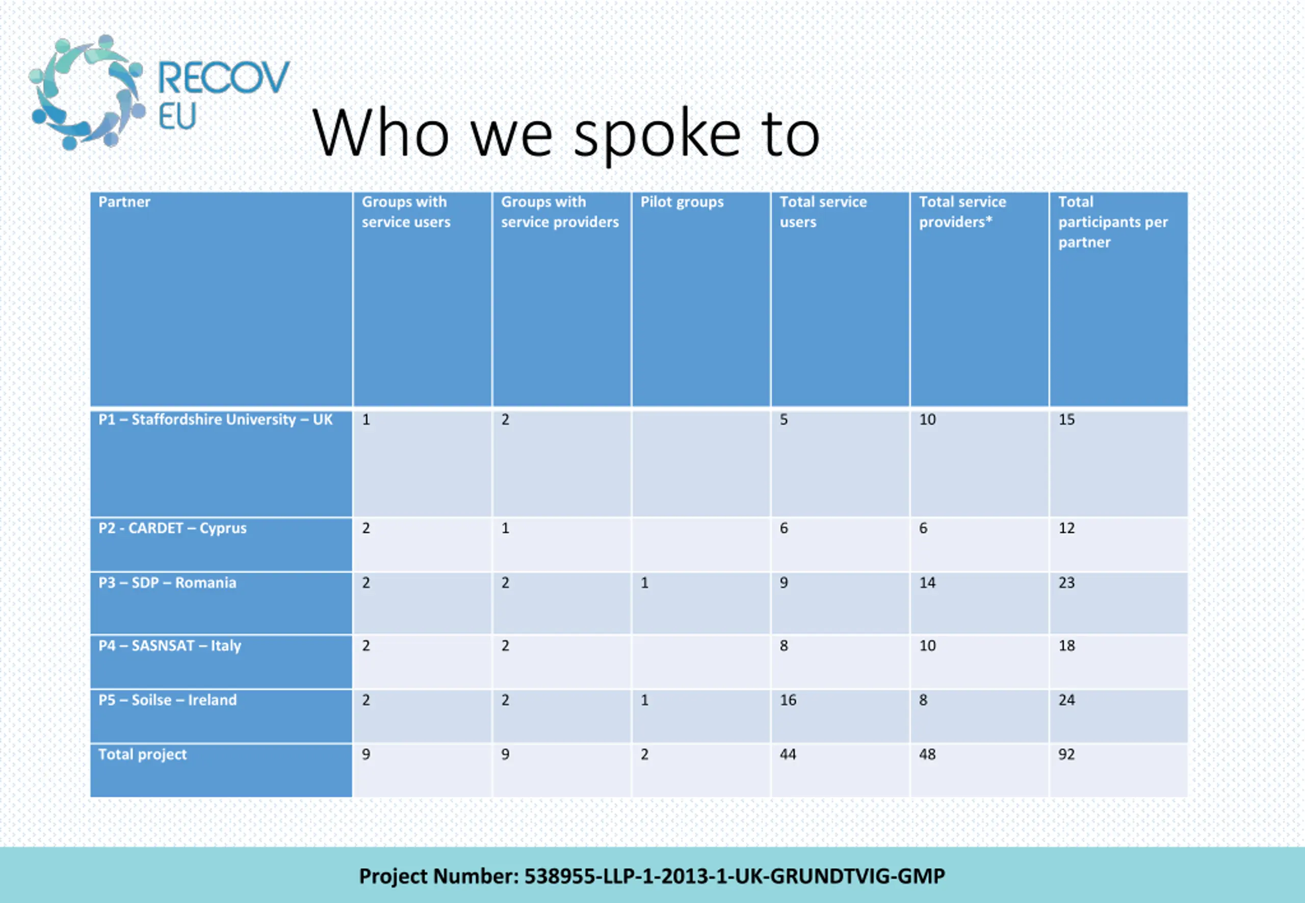 Who we spoke to Partner Groups with service users Groups with service providers Pilot groups Total service users Total service providers* Total participants per partner P1 Staffordshire University UK 1 2 5 10 15 P2 - CARDET Cyprus 2 1 6 6 12 P3 SDP Romania 2 2 1 9 14 23 P4 SASNSAT Italy 2 2 8 10 18 P5 Soilse Ireland 2 2 1 16 8 24 Total project 9 9 2 44 48 92 Project Number: 538955-LLP-1-2013-1-UK-GRUNDTVIG-GMP