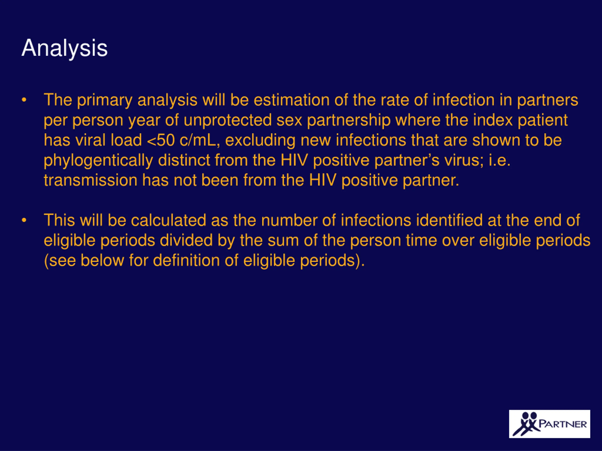 Analysis The primary analysis will be estimation of the rate of infection in partners per person year of unprotected sex partnership where the index patient has viral load <50 c/mL, excluding new infections that are shown to be phylogentically distinct from the HIV positive partner s virus; i.e. transmission has not been from the HIV positive partner. This will be calculated as the number of infections identified at the end of eligible periods divided by the sum of the person time over eligible periods (see below for definition of eligible periods).