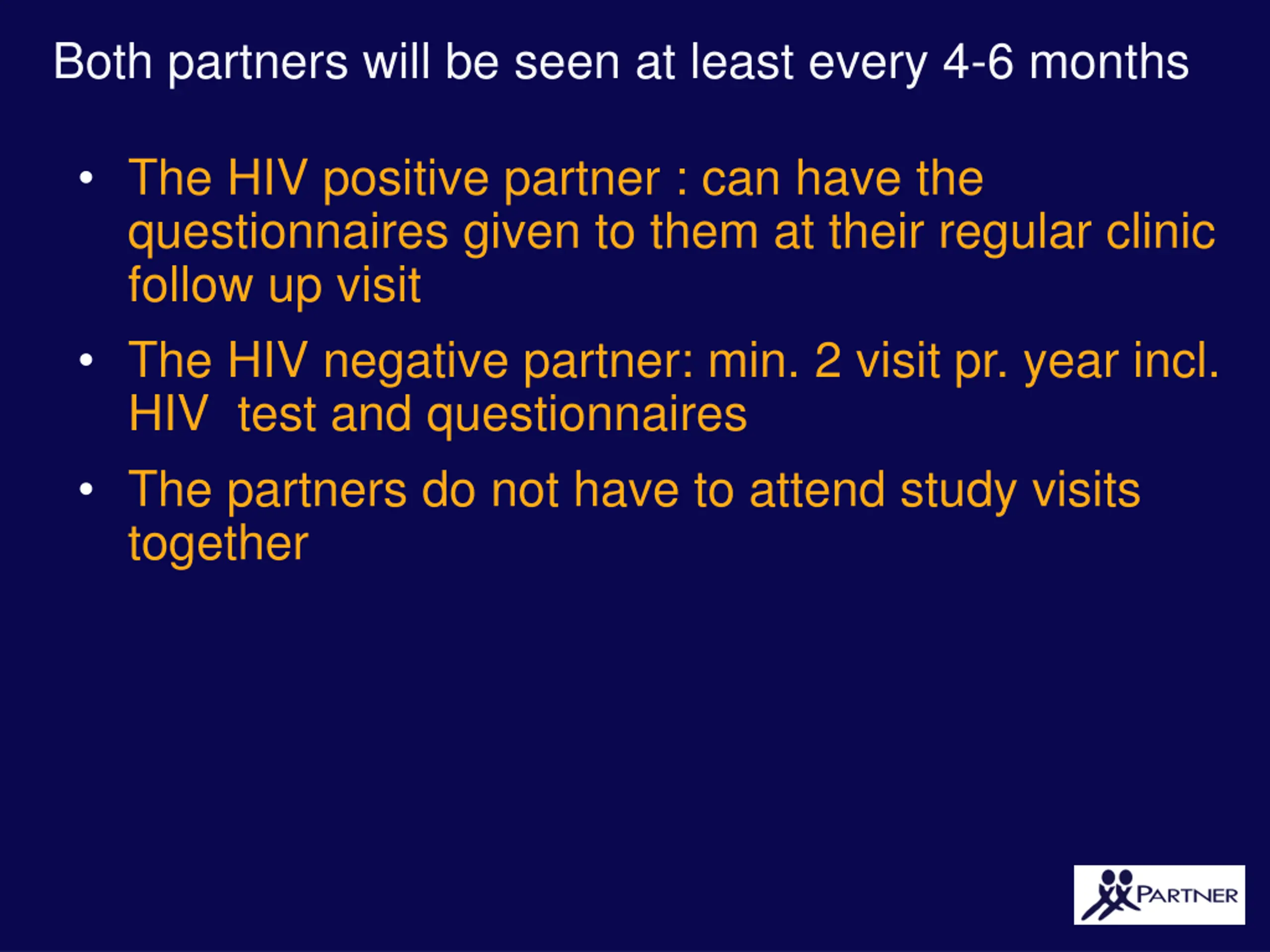 Both partners will be seen at least every 4-6 months The HIV positive partner : can have the questionnaires given to them at their regular clinic follow up visit The HIV negative partner: min. 2 visit pr. year incl. HIV test and questionnaires The partners do not have to attend study visits together