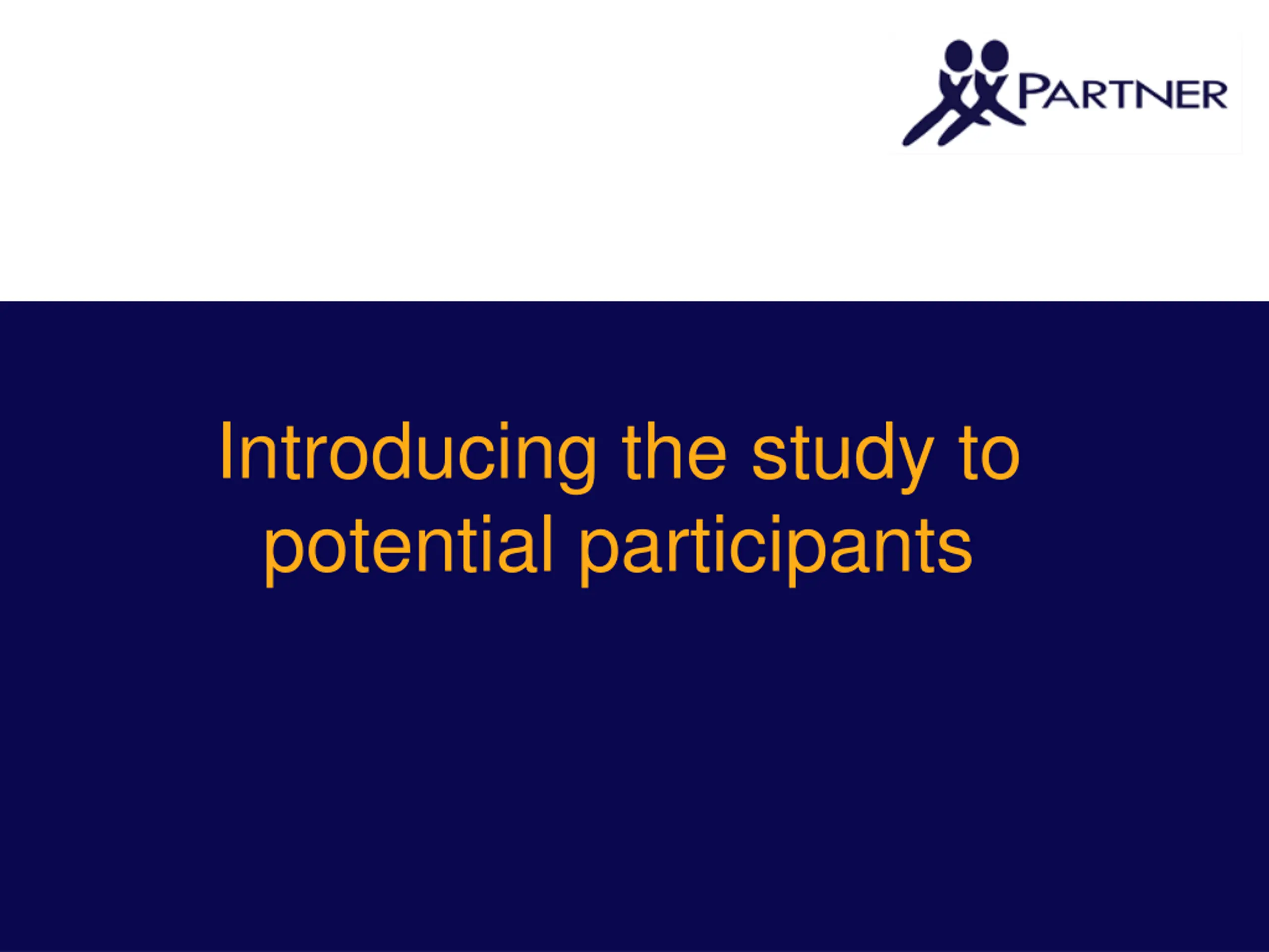 Strategies for enrolling pairs at site Start with asking if they have an HIV negative partner If yes, give a VERY short introduction to the PARTNER study and refer to the research nurses/staff It is recommended for the study nurse to inquire about sex without condom and other inclusion criteria. Some HIV positive people may not feel comfortable discussing this with their physician.