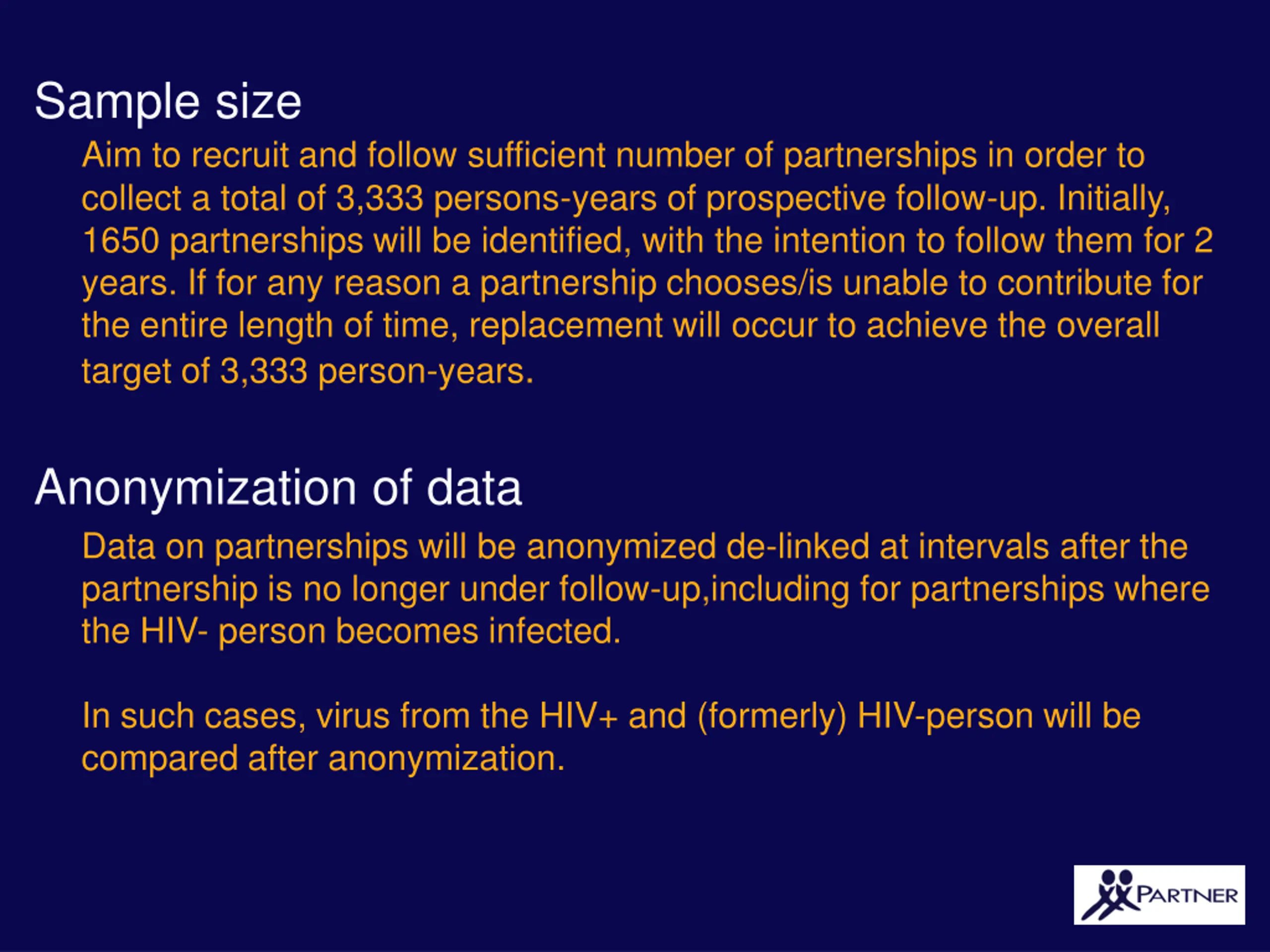 Sample size Aim to recruit and follow sufficient number of partnerships in order to collect a total of 3,333 persons-years of prospective follow-up. Initially, 1650 partnerships will be identified, with the intention to follow them for 2 years. If for any reason a partnership chooses/is unable to contribute for the entire length of time, replacement will occur to achieve the overall target of 3,333 person-years. Anonymization of data Data on partnerships will be anonymized de-linked at intervals after the partnership is no longer under follow-up,including for partnerships where the HIV- person becomes infected. In such cases, virus from the HIV+ and (formerly) HIV-person will be compared after anonymization.