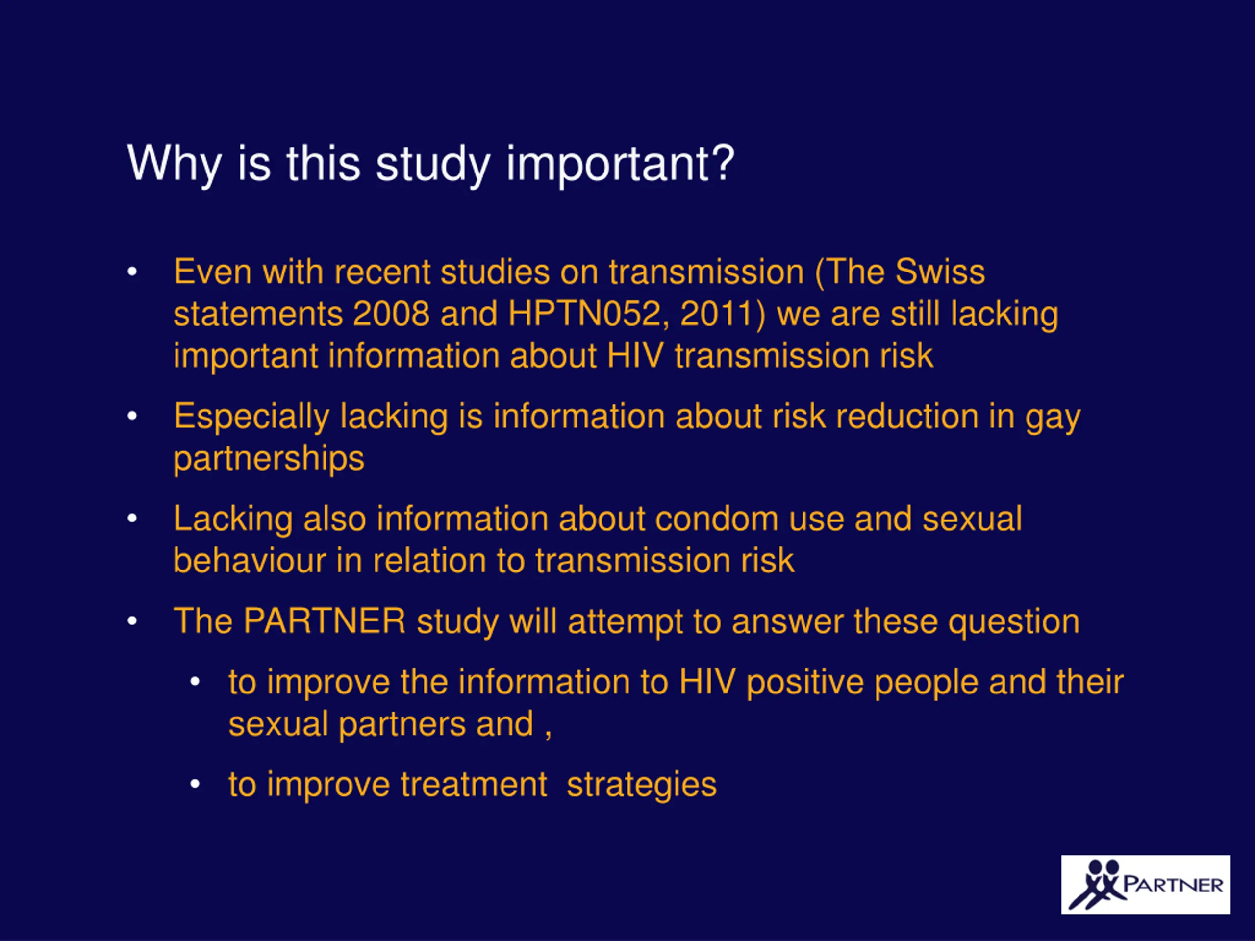 Why is this study important? Even with recent studies on transmission (The Swiss statements 2008 and HPTN052, 2011) we are still lacking important information about HIV transmission risk Especially lacking is information about risk reduction in gay partnerships Lacking also information about condom use and sexual behaviour in relation to transmission risk The PARTNER study will attempt to answer these question to improve the information to HIV positive people and their sexual partners and , to improve treatment strategies