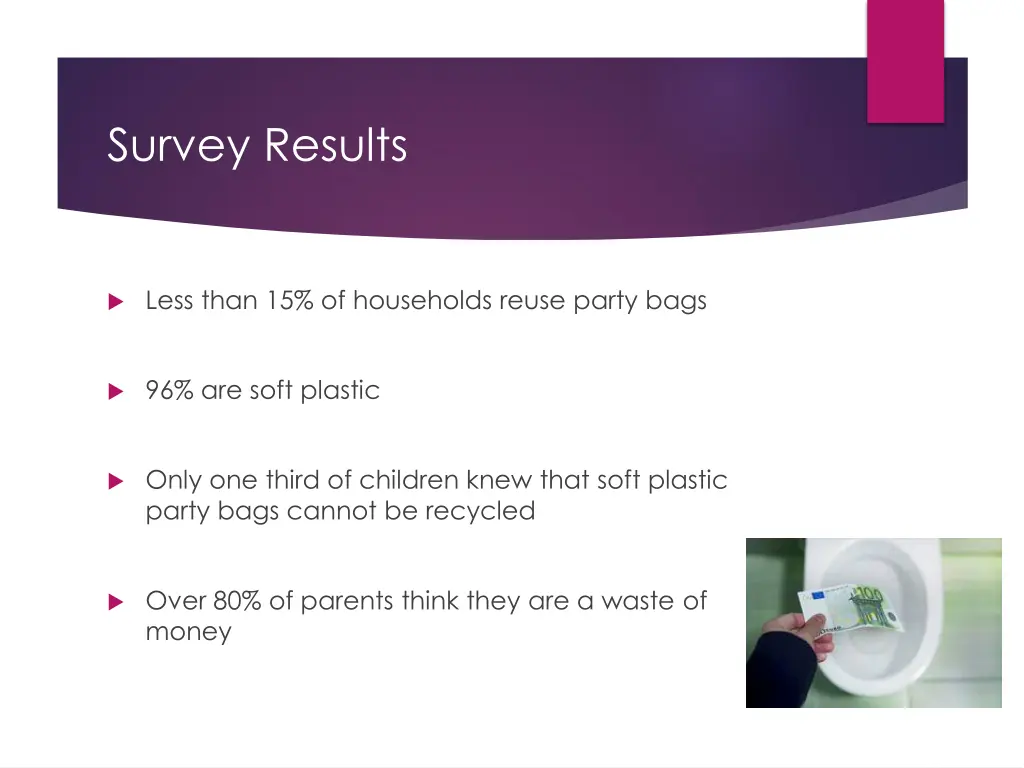 Survey Results Less than 15% of households reuse party bags 96% are soft plastic Only one third of children knew that soft plastic party bags cannot be recycled Over 80% of parents think they are a waste of money