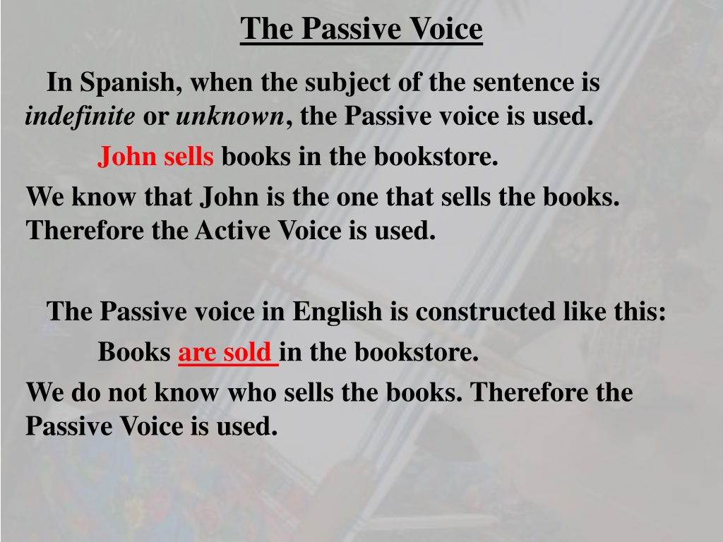 The Passive Voice In Spanish, when the subject of the sentence is indefinite or unknown, the Passive voice is used. John sells books in the bookstore. We know that John is the one that sells the books. Therefore the Active Voice is used. The Passive voice in English is constructed like this: Books are sold in the bookstore. We do not know who sells the books. Therefore the Passive Voice is used.