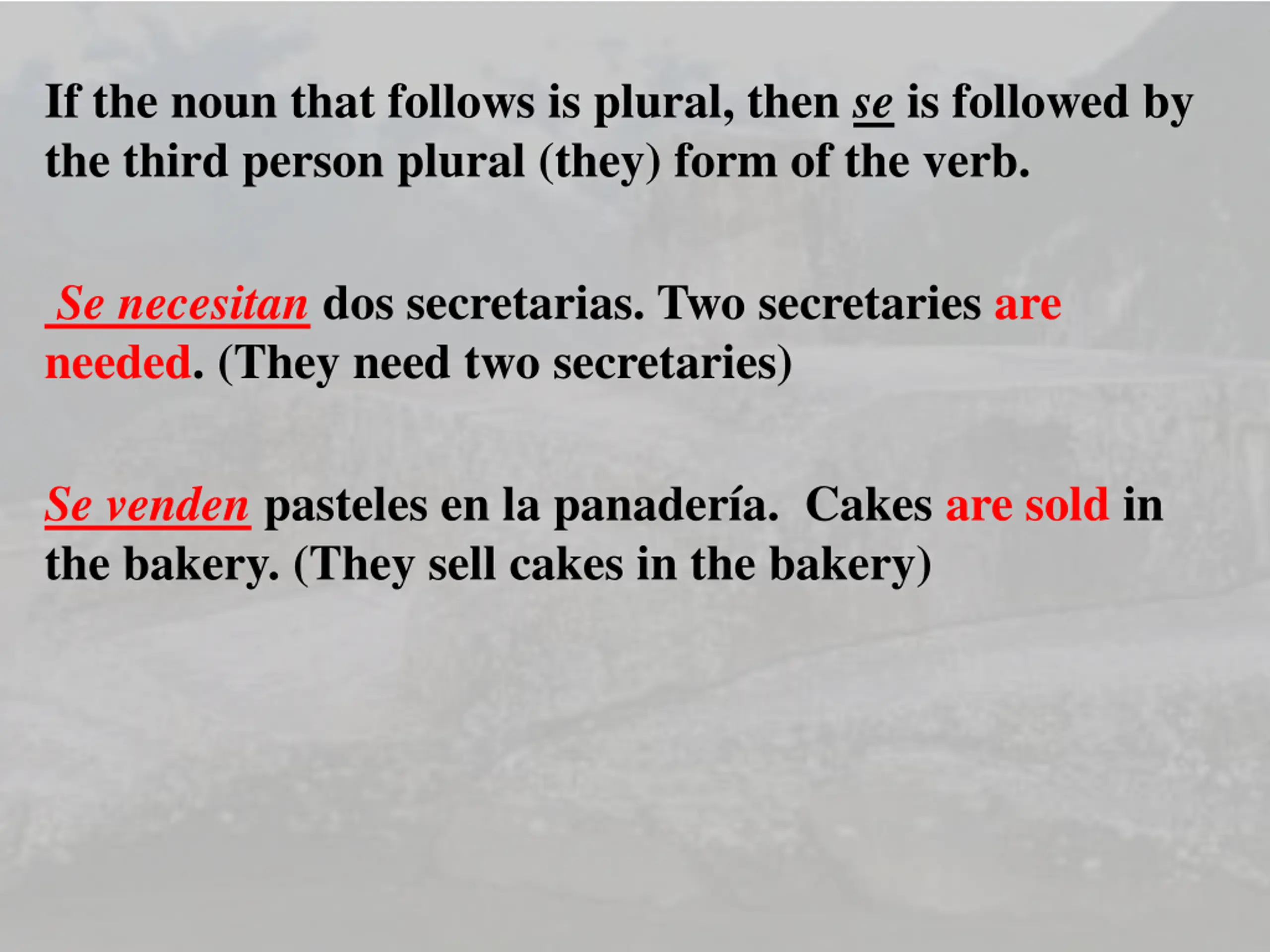 If the noun that follows is plural, then se is followed by the third person plural (they) form of the verb. Se necesitan dos secretarias. Two secretaries are needed. (They need two secretaries) Se venden pasteles en la panader a. Cakes are sold in the bakery. (They sell cakes in the bakery)