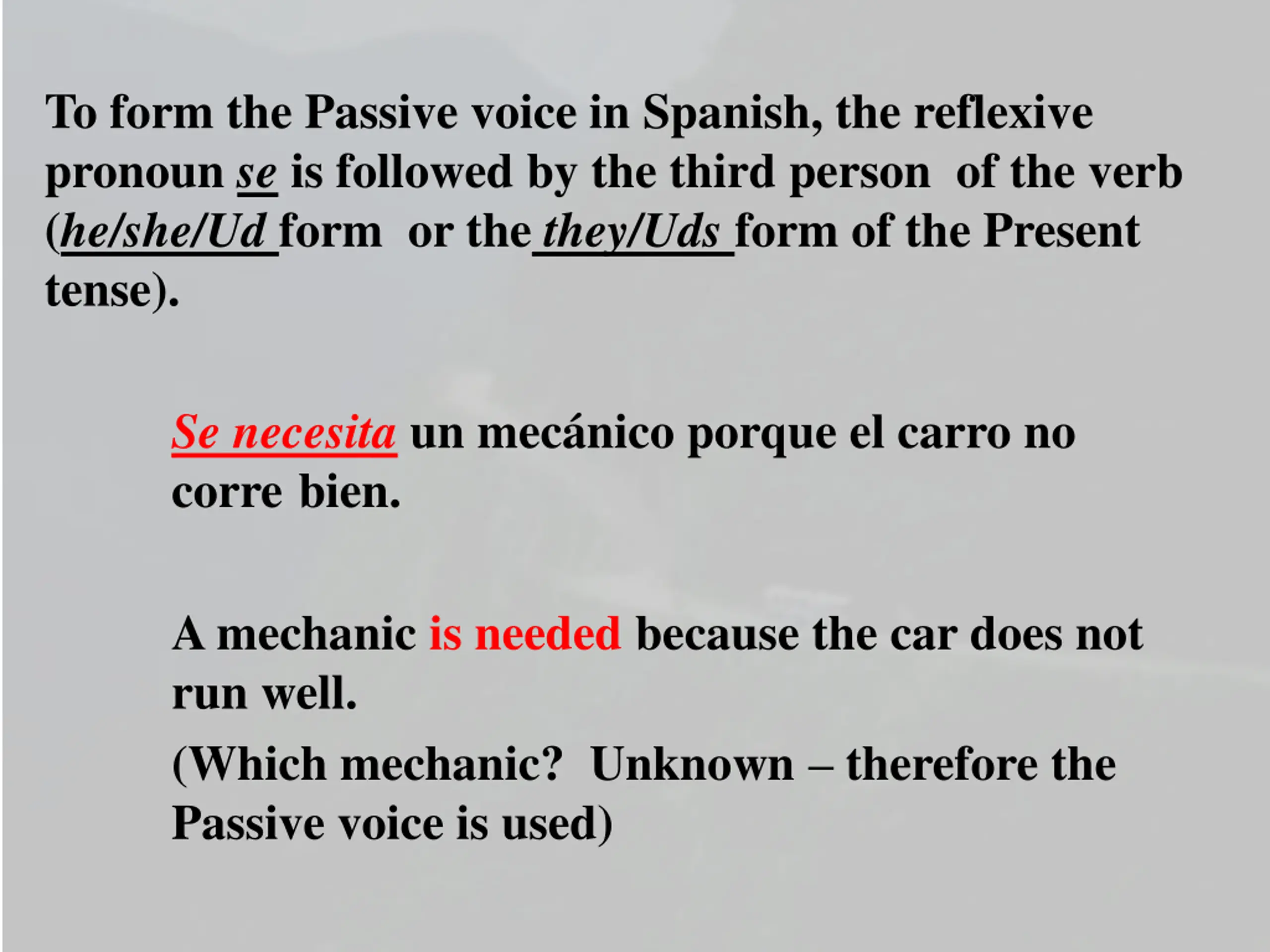 To form the Passive voice in Spanish, the reflexive pronoun se is followed by the third person of the verb (he/she/Ud form or the they/Uds form of the Present tense). Se necesita un mec nico porque el carro no corre bien. A mechanic is needed because the car does not run well. (Which mechanic? Unknown therefore the Passive voice is used)