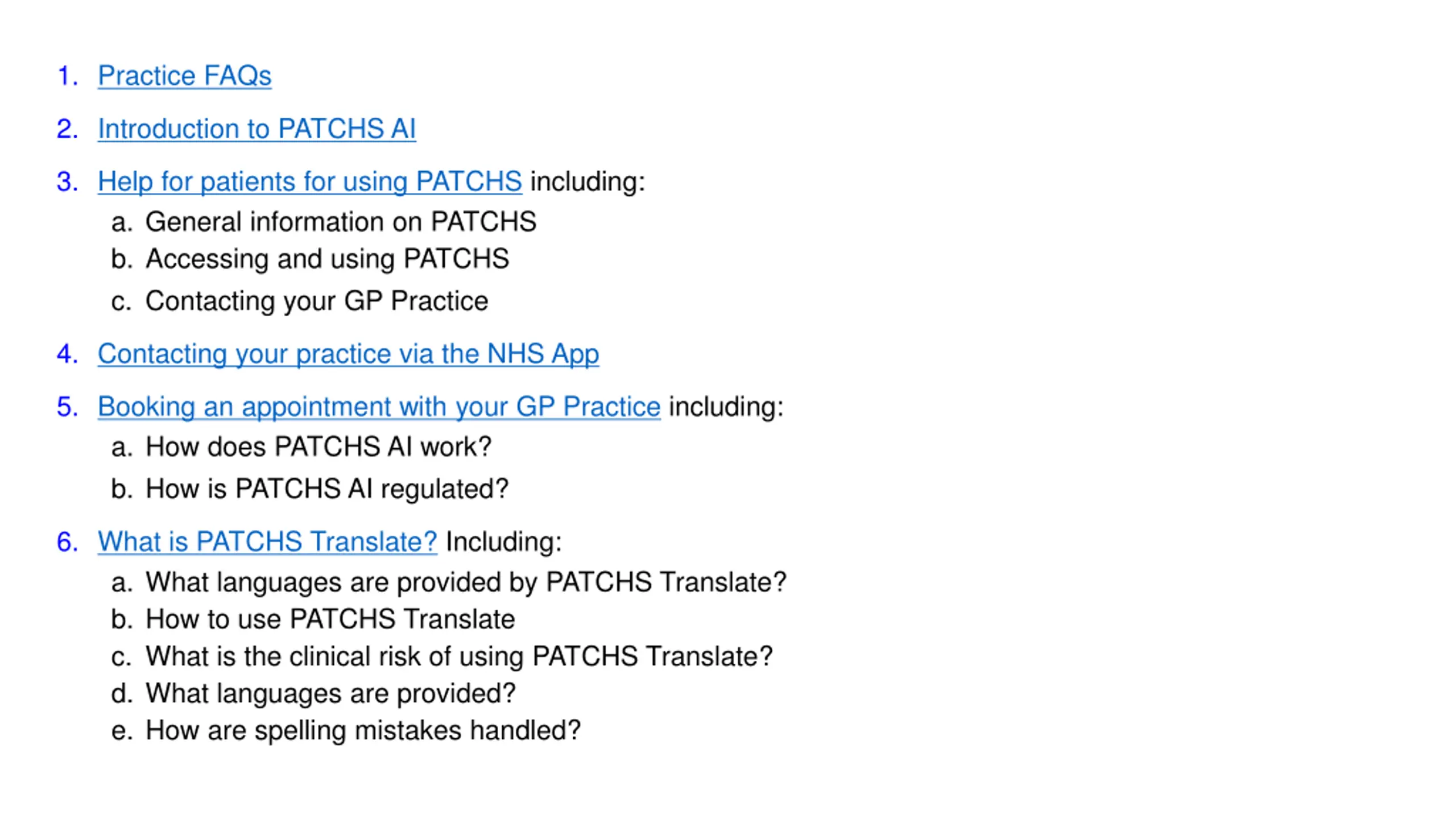 1. Practice FAQs 2. Introduction to PATCHS AI 3. Help for patients for using PATCHS including: a. General information on PATCHS b. Accessing and using PATCHS c. Contacting your GP Practice 4. Contacting your practice via the NHS App 5. Booking an appointment with your GP Practice including: a. How does PATCHS AI work? b. How is PATCHS AI regulated? 6. What is PATCHS Translate? Including: a. What languages are provided by PATCHS Translate? b. How to use PATCHS Translate c. What is the clinical risk of using PATCHS Translate? d. What languages are provided? e. How are spelling mistakes handled?
