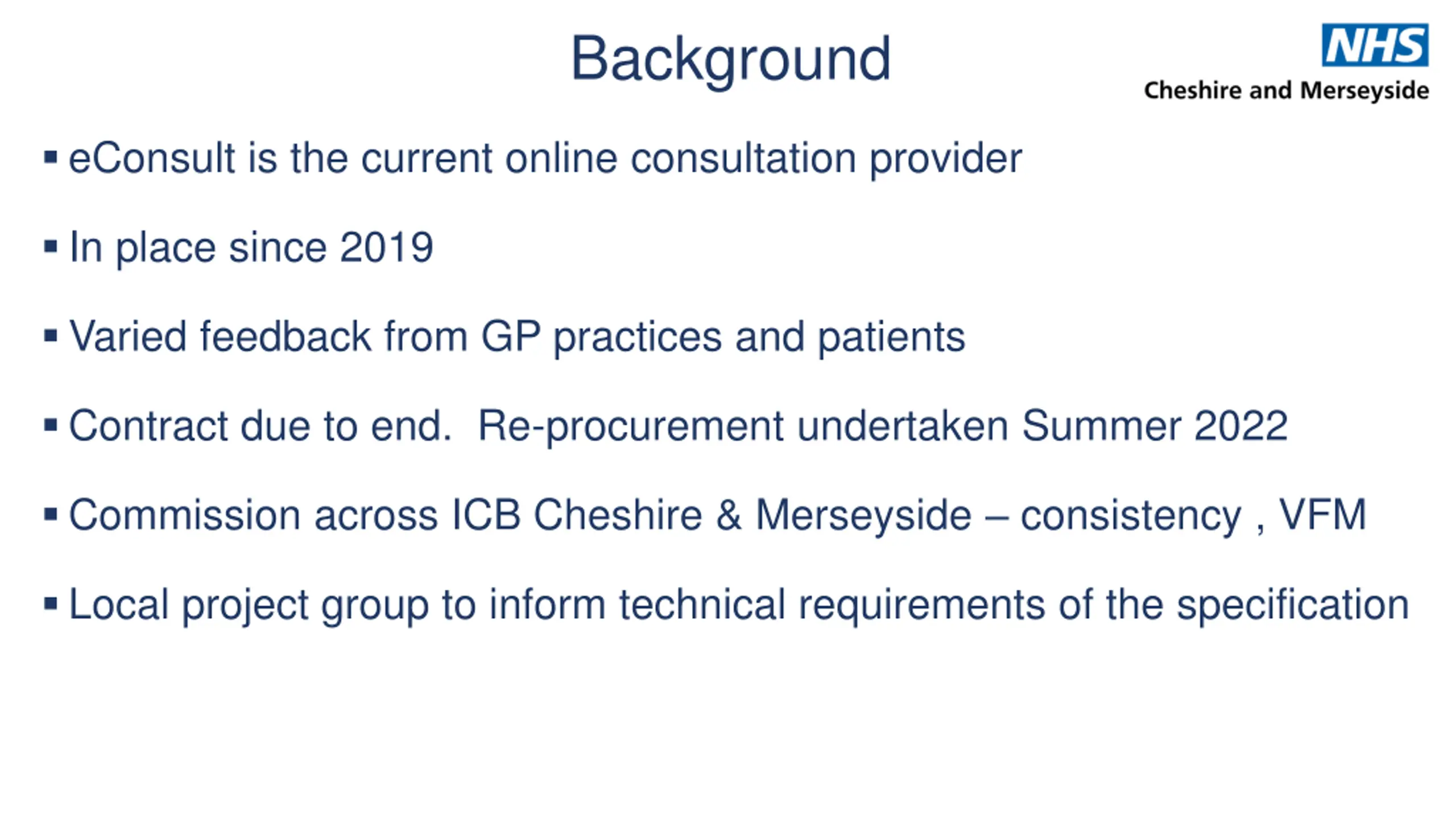 Background eConsult is the current online consultation provider In place since 2019 Varied feedback from GP practices and patients Contract due to end. Re-procurement undertaken Summer 2022 Commission across ICB Cheshire & Merseyside consistency , VFM Local project group to inform technical requirements of the specification