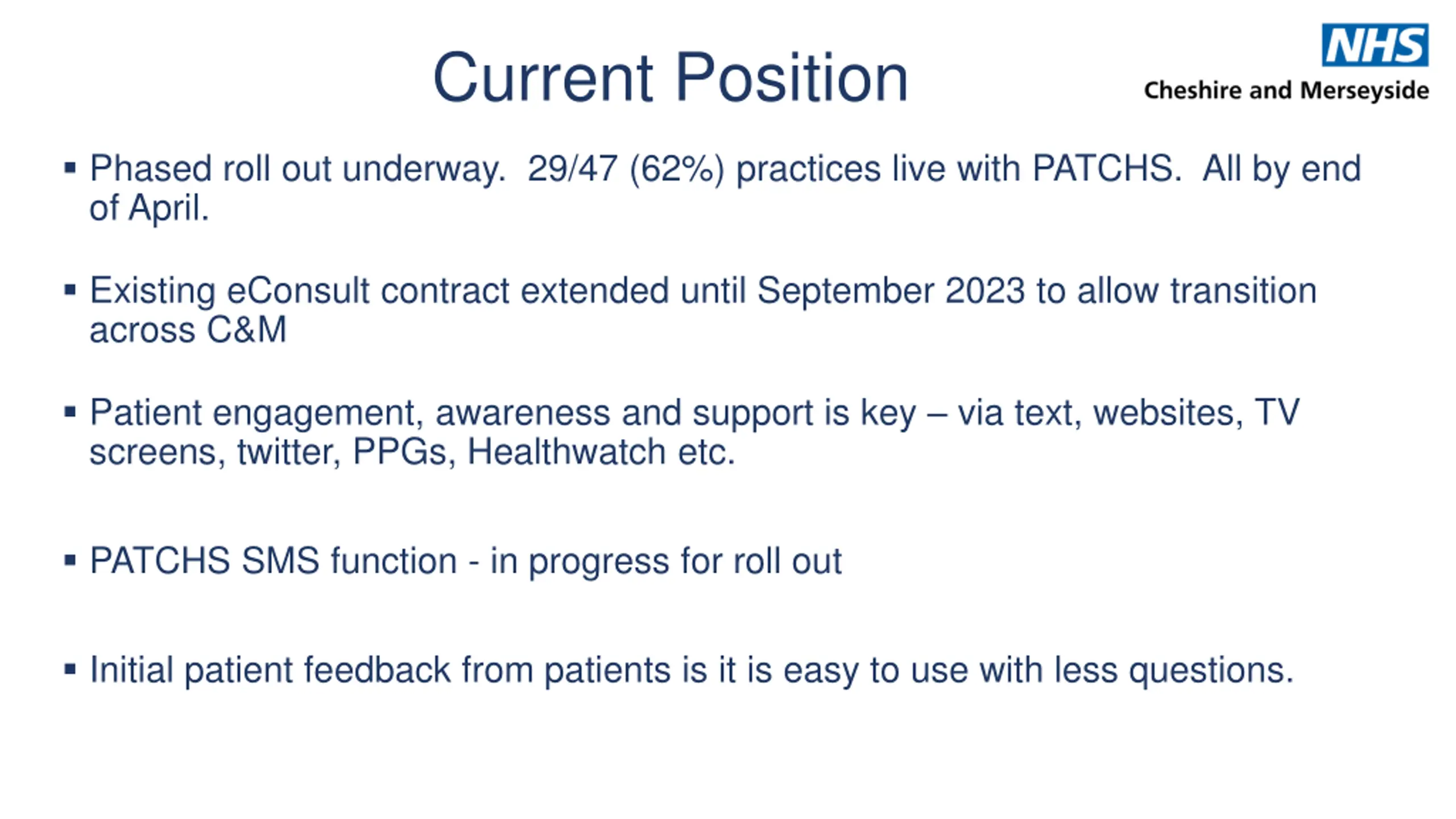 Current Position Phased roll out underway. 29/47 (62%) practices live with PATCHS. All by end of April. Existing eConsult contract extended until September 2023 to allow transition across C&M Patient engagement, awareness and support is key via text, websites, TV screens, twitter, PPGs, Healthwatch etc. PATCHS SMS function - in progress for roll out Initial patient feedback from patients is it is easy to use with less questions.