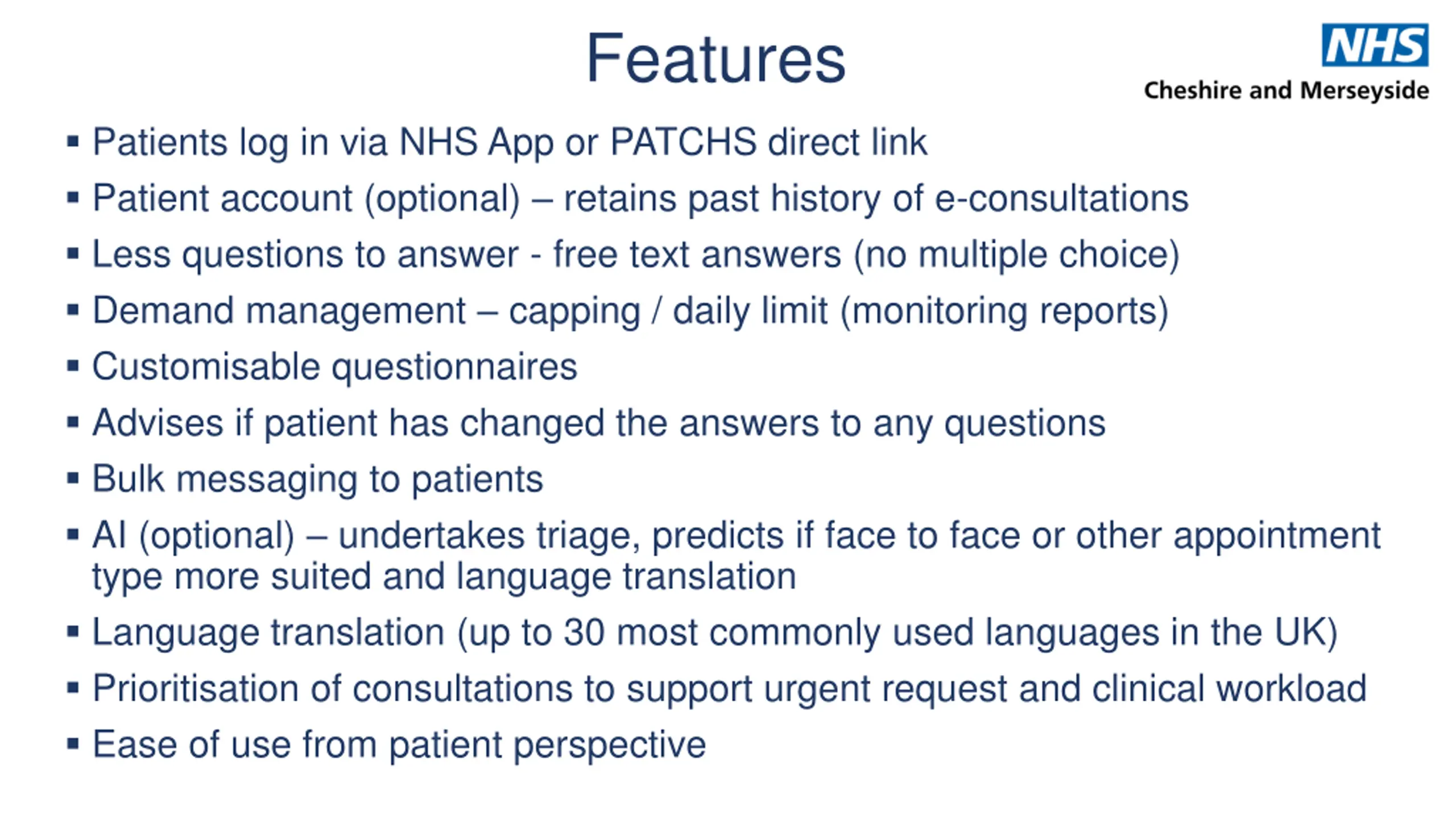 Features Patients log in via NHS App or PATCHS direct link Patient account (optional) retains past history of e-consultations Less questions to answer - free text answers (no multiple choice) Demand management capping / daily limit (monitoring reports) Customisable questionnaires Advises if patient has changed the answers to any questions Bulk messaging to patients AI (optional) undertakes triage, predicts if face to face or other appointment type more suited and language translation Language translation (up to 30 most commonly used languages in the UK) Prioritisation of consultations to support urgent request and clinical workload Ease of use from patient perspective