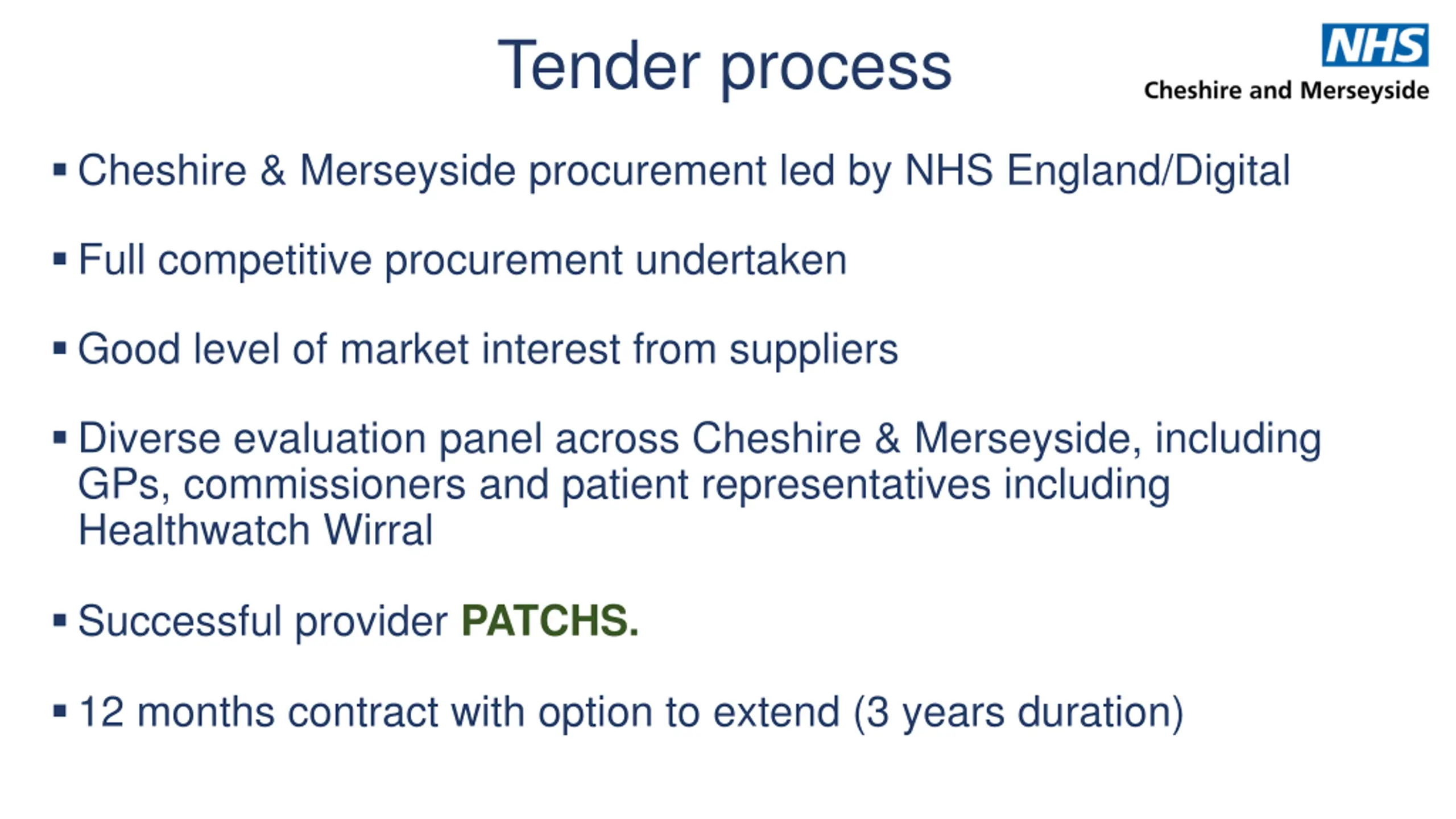 Tender process Cheshire & Merseyside procurement led by NHS England/Digital Full competitive procurement undertaken Good level of market interest from suppliers Diverse evaluation panel across Cheshire & Merseyside, including GPs, commissioners and patient representatives including Healthwatch Wirral Successful provider PATCHS. 12 months contract with option to extend (3 years duration)