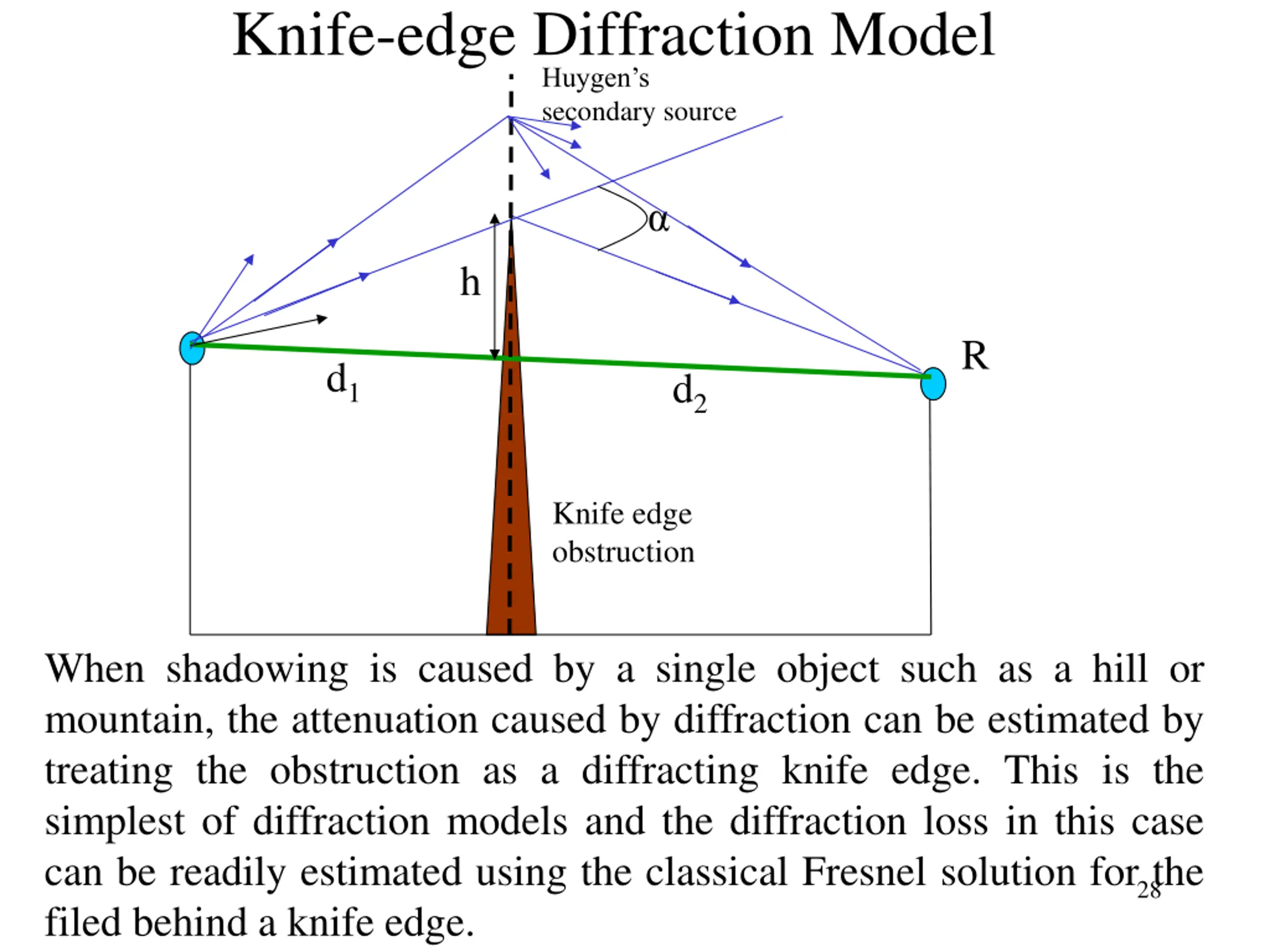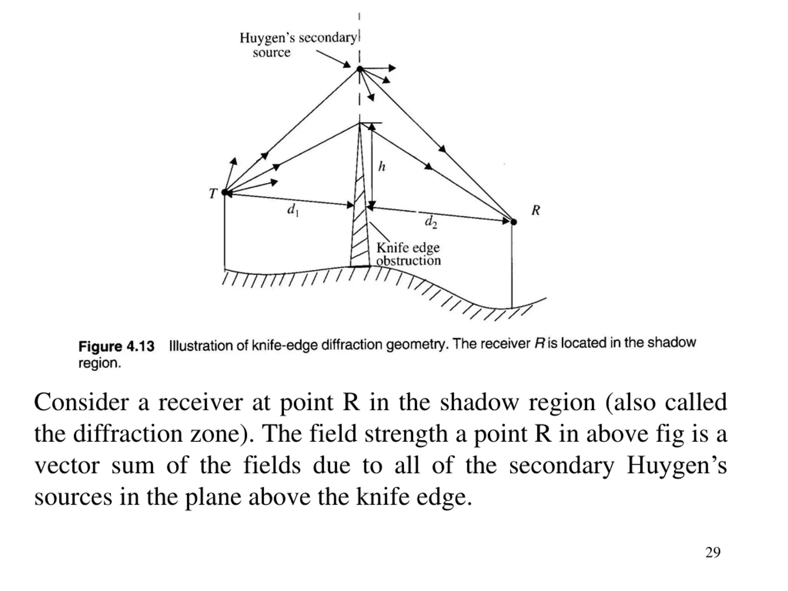 Knife-edge Diffraction Model Huygen s secondary source h R d1 d2 Knife edge obstruction When shadowing is caused by a single object such as a hill or mountain, the attenuation caused by diffraction can be estimated by treating the obstruction as a diffracting knife edge. This is the simplest of diffraction models and the diffraction loss in this case can be readily estimated using the classical Fresnel solution for the filed behind a knife edge. 28