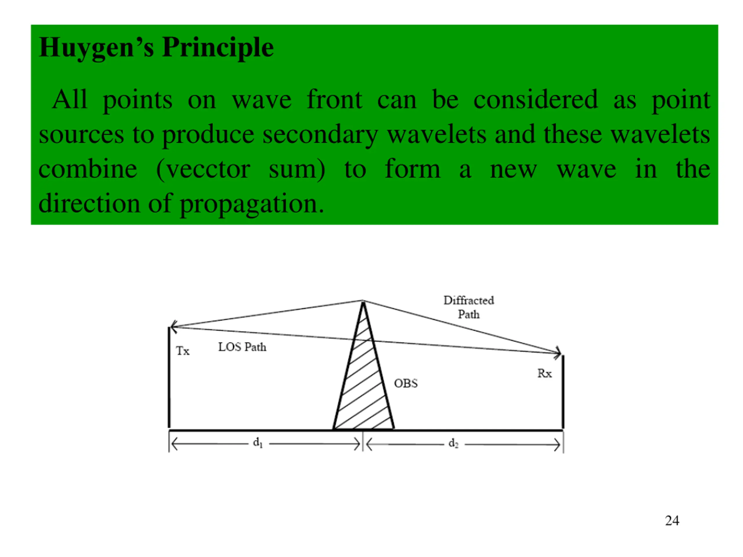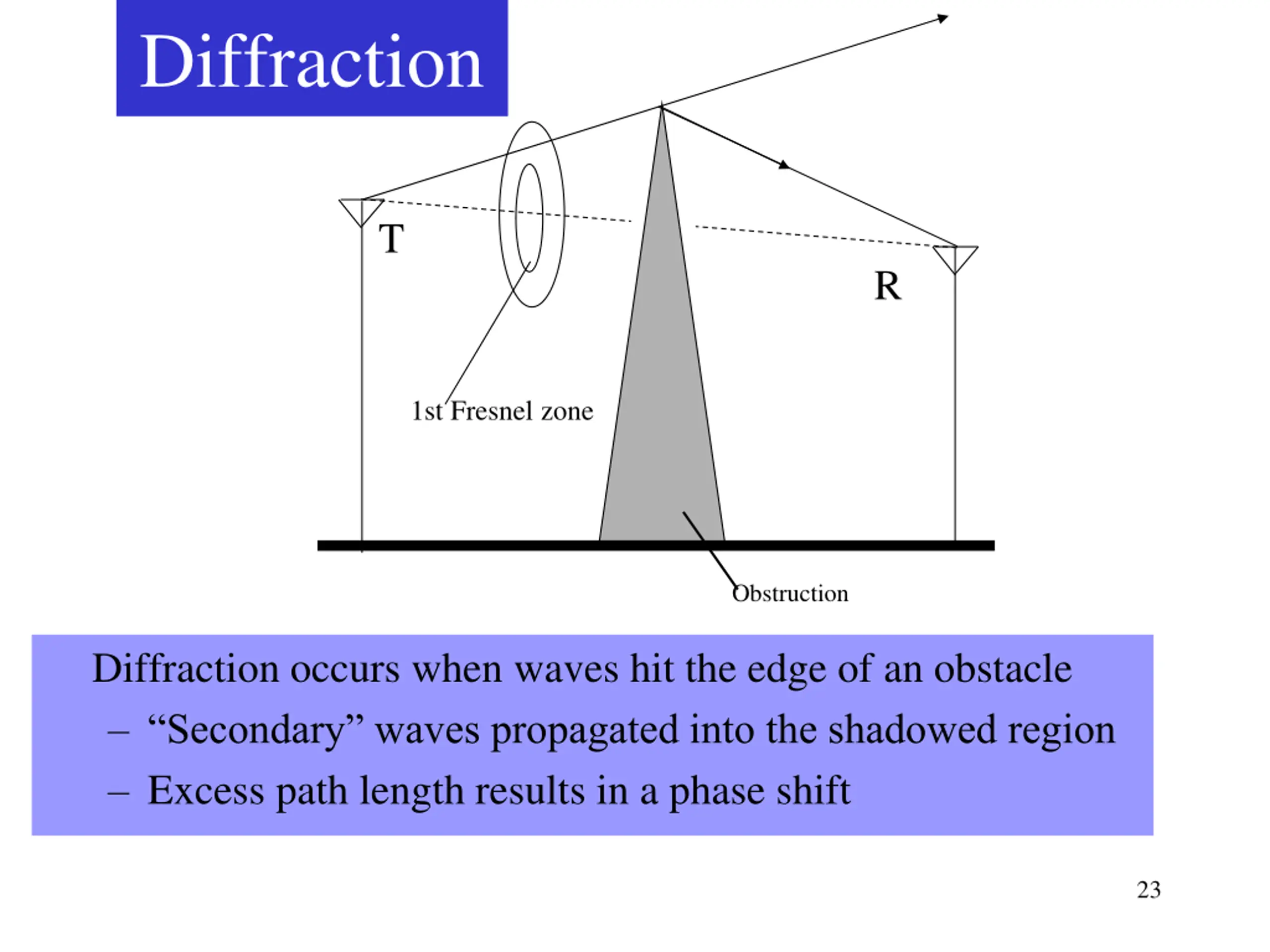 Diffraction T R 1st Fresnel zone Obstruction Diffraction occurs when waves hit the edge of an obstacle Secondary waves propagated into the shadowed region Excess path length results in a phase shift 23