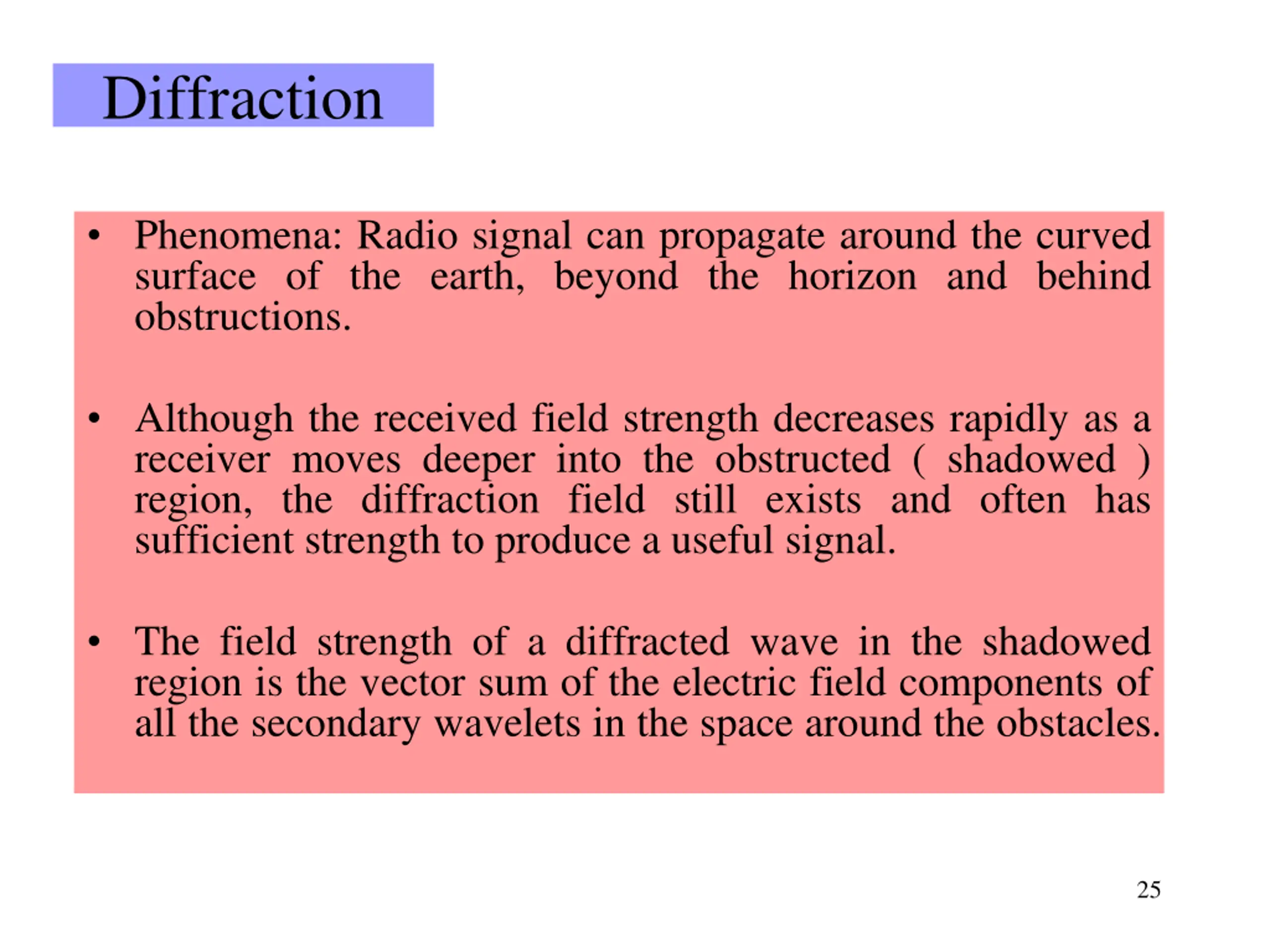 Diffraction Phenomena: Radio signal can propagate around the curved surface of the earth, beyond the horizon and behind obstructions. Although the received field strength decreases rapidly as a receiver moves deeper into the obstructed ( shadowed ) region, the diffraction field still exists and often has sufficient strength to produce a useful signal. The field strength of a diffracted wave in the shadowed region is the vector sum of the electric field components of all the secondary wavelets in the space around the obstacles. 25