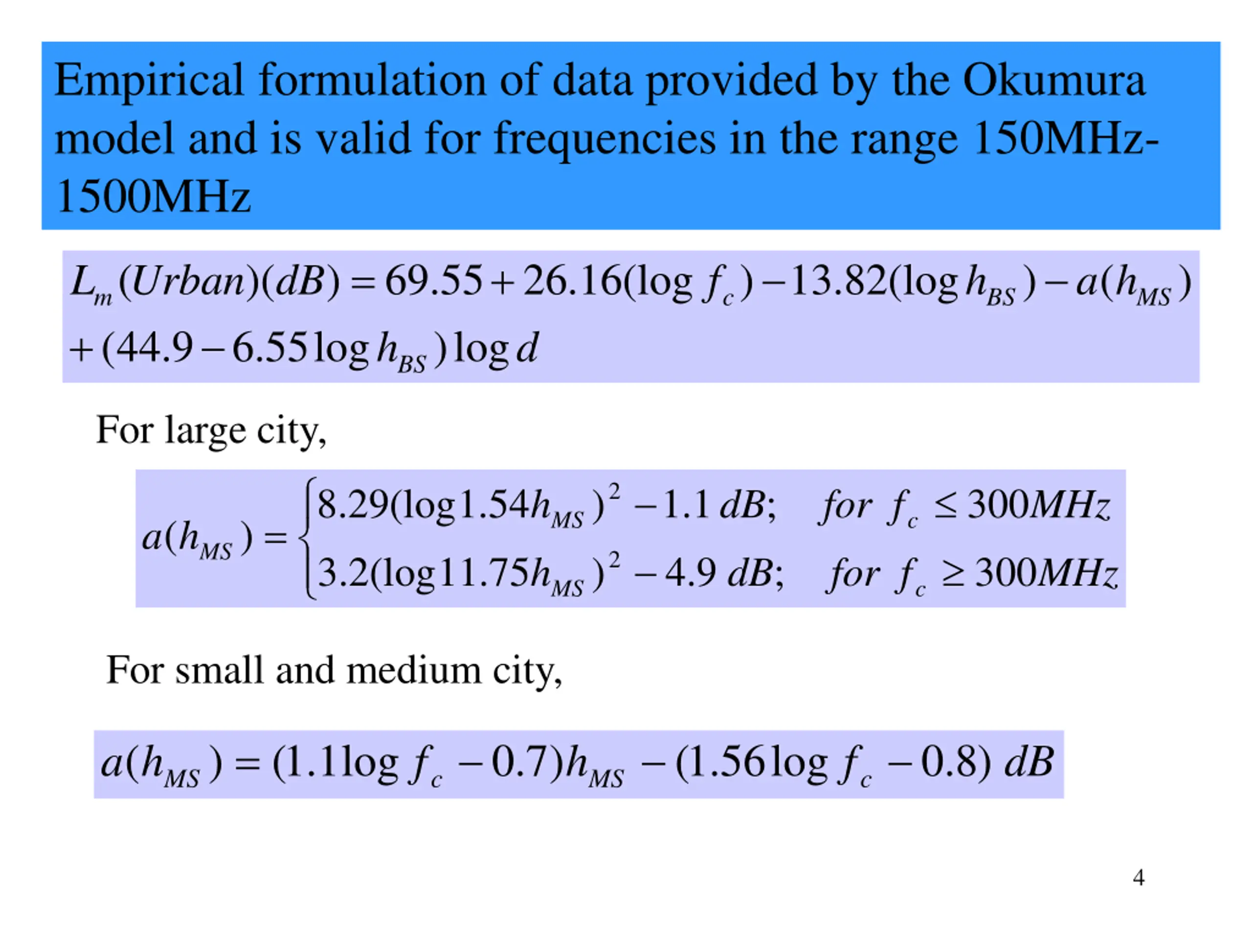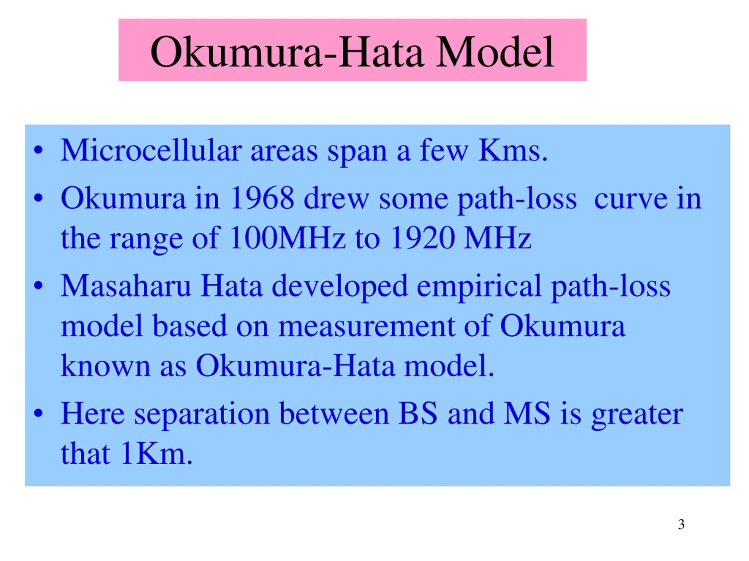 Okumura-Hata Model Microcellular areas span a few Kms. Okumura in 1968 drew some path-loss curve in the range of 100MHz to 1920 MHz Masaharu Hata developed empirical path-loss model based on measurement of Okumura known as Okumura-Hata model. Here separation between BS and MS is greater that 1Km. 3