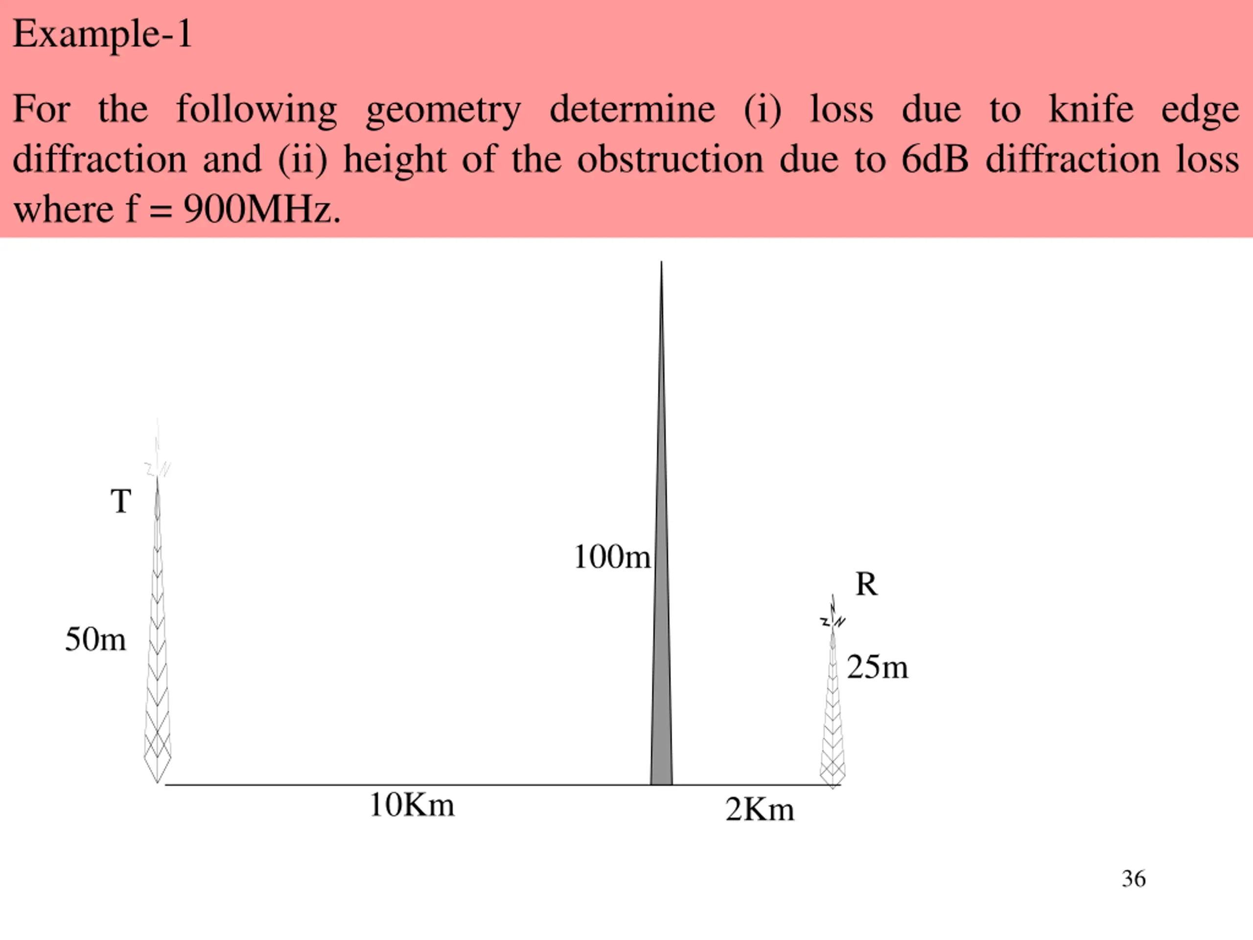 Example-1 For the following geometry determine (i) loss due to knife edge diffraction and (ii) height of the obstruction due to 6dB diffraction loss where f = 900MHz. T 100m R 50m 25m 10Km 2Km 36
