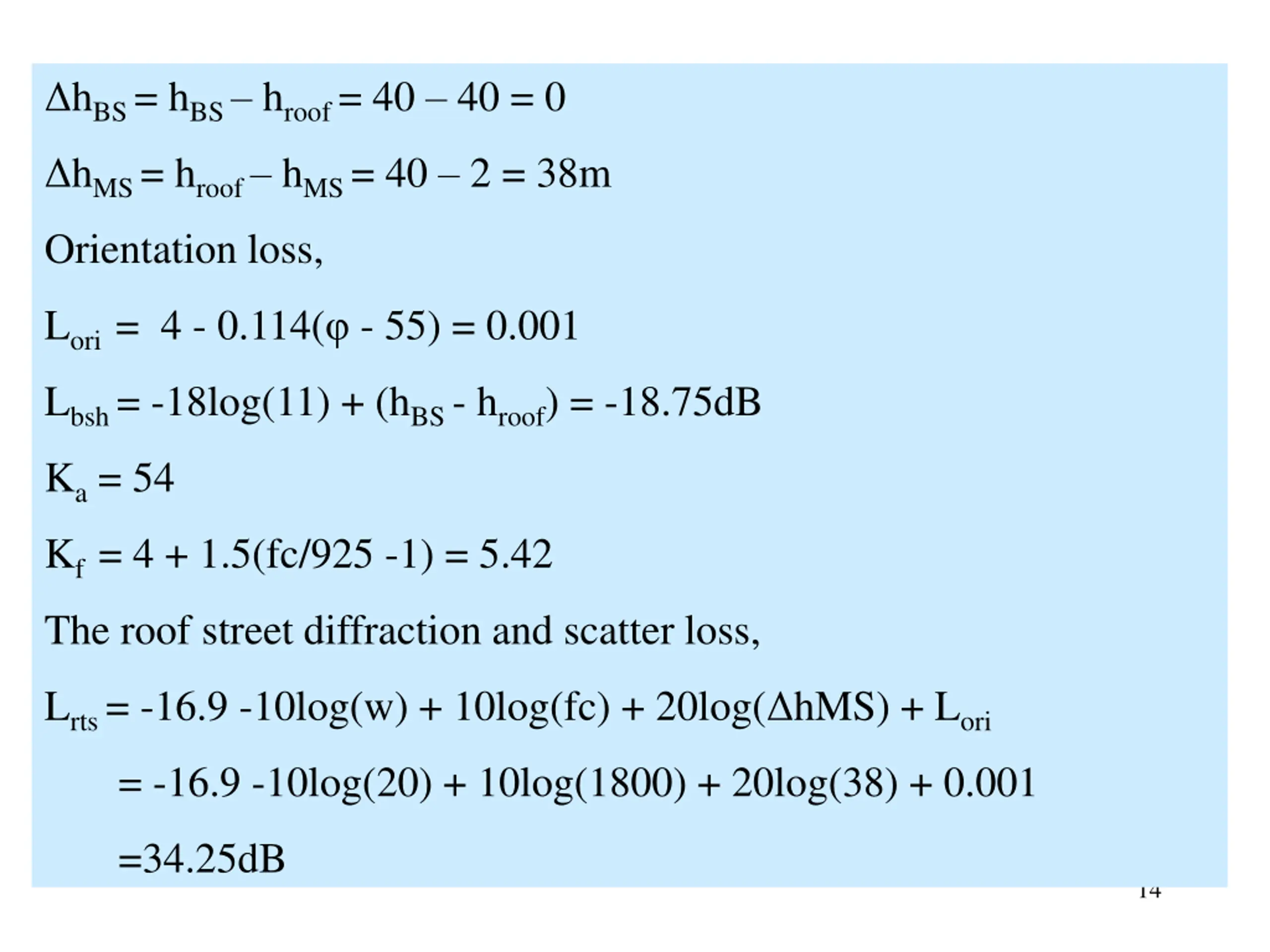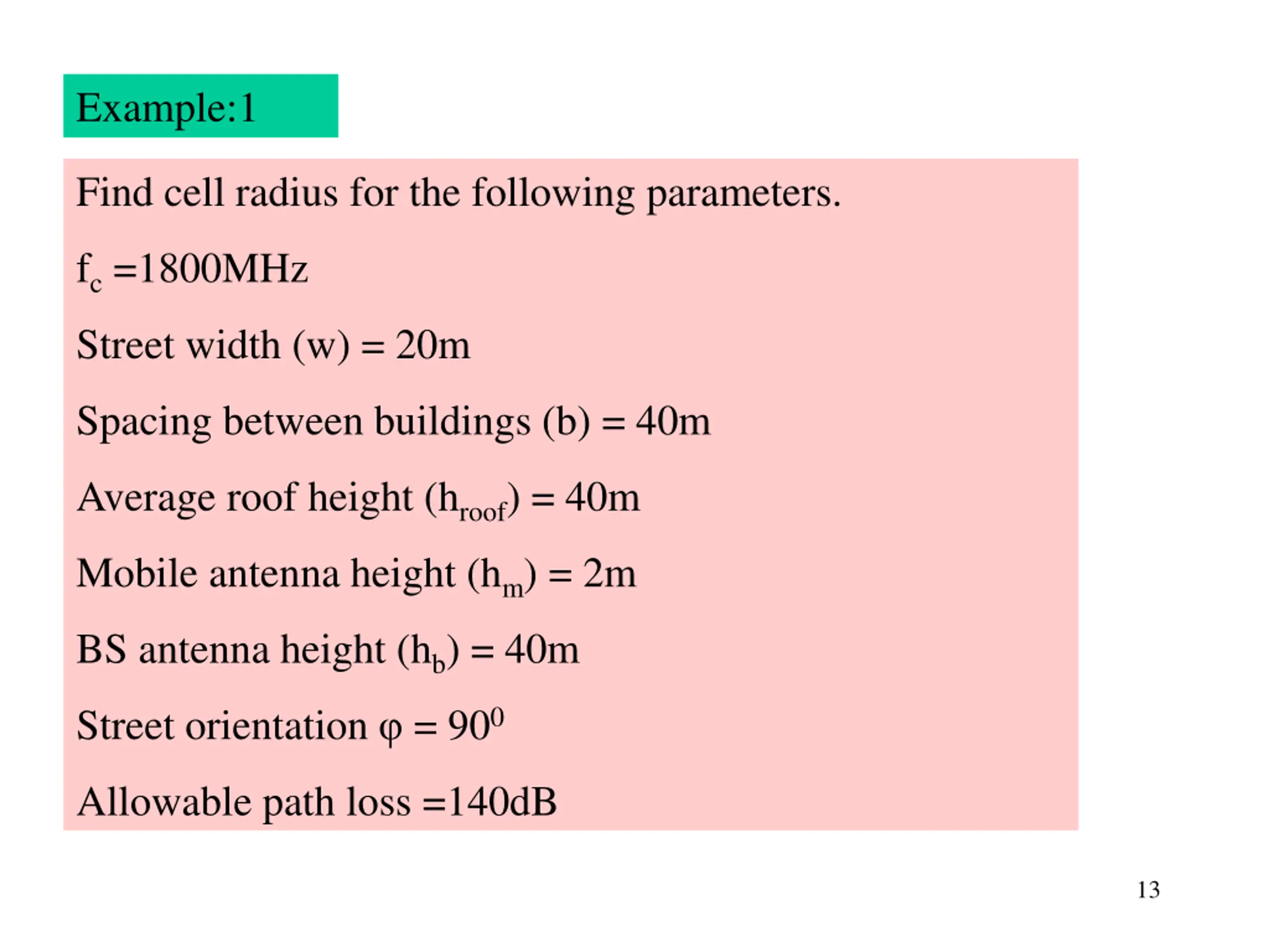 Example:1 Find cell radius for the following parameters. fc =1800MHz Street width (w) = 20m Spacing between buildings (b) = 40m Average roof height (hroof) = 40m Mobile antenna height (hm) = 2m BS antenna height (hb) = 40m Street orientation = 900 Allowable path loss =140dB 13