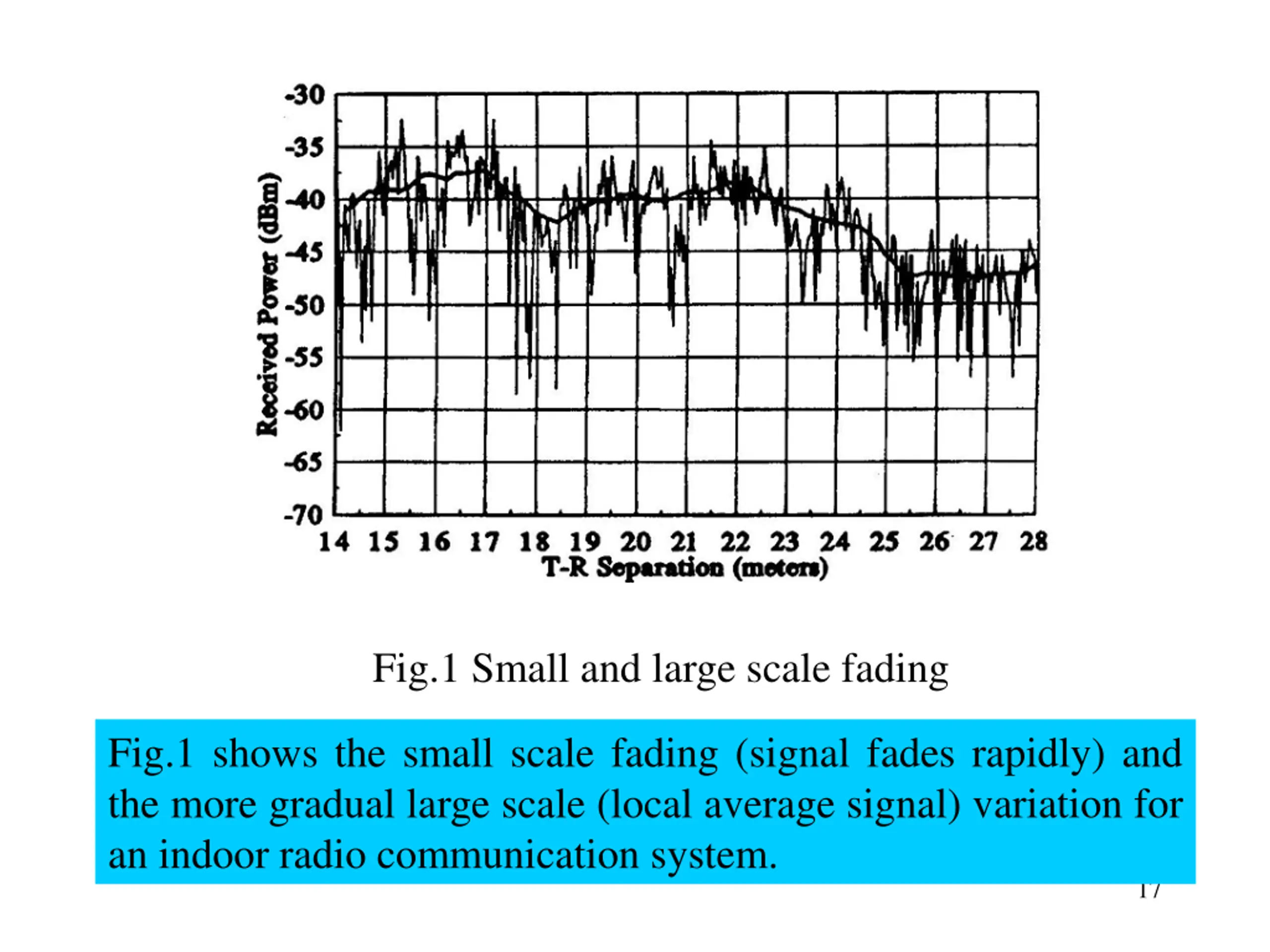 Fig.1 Small and large scale fading Fig.1 shows the small scale fading (signal fades rapidly) and the more gradual large scale (local average signal) variation for an indoor radio communication system. 17