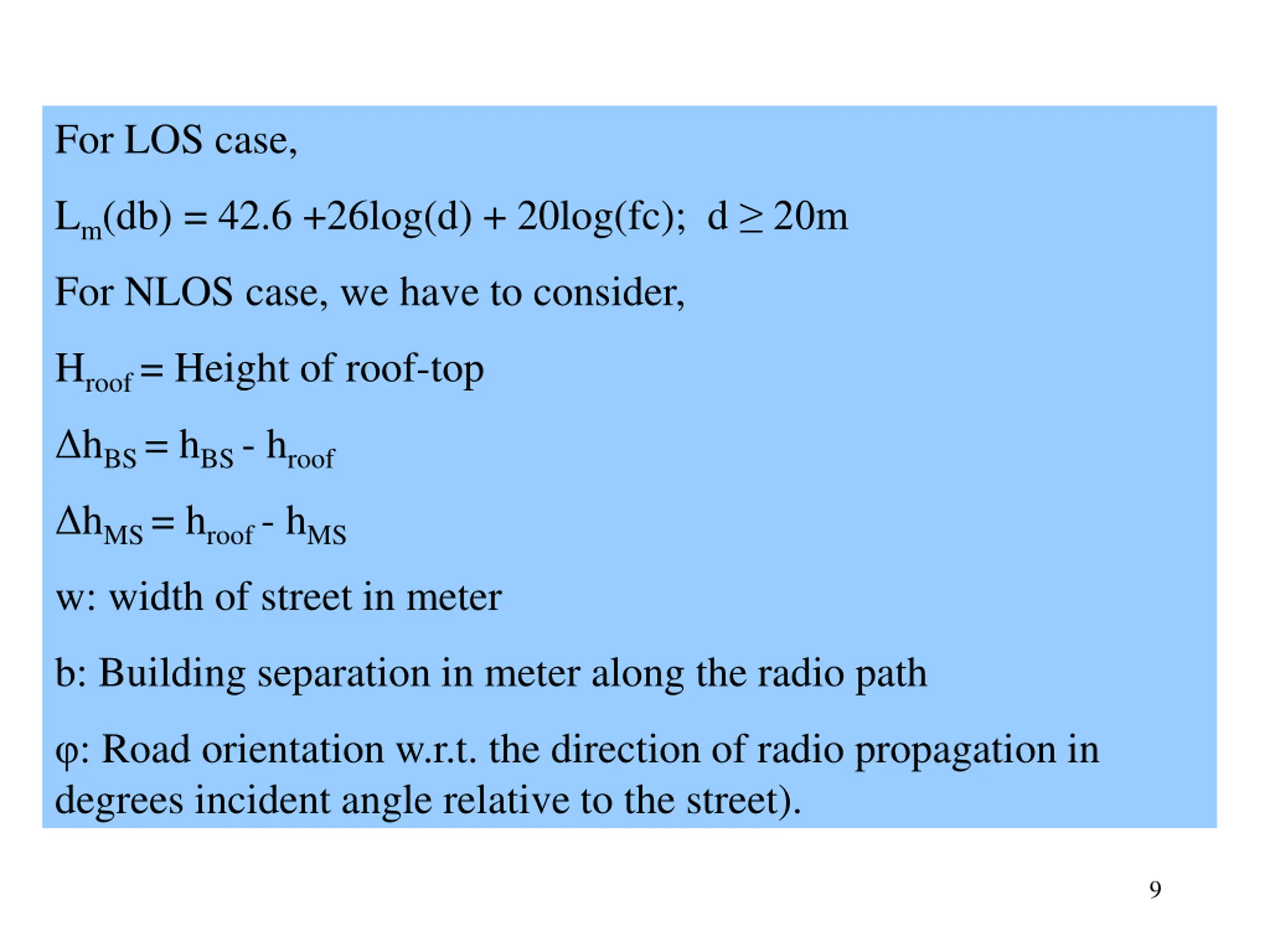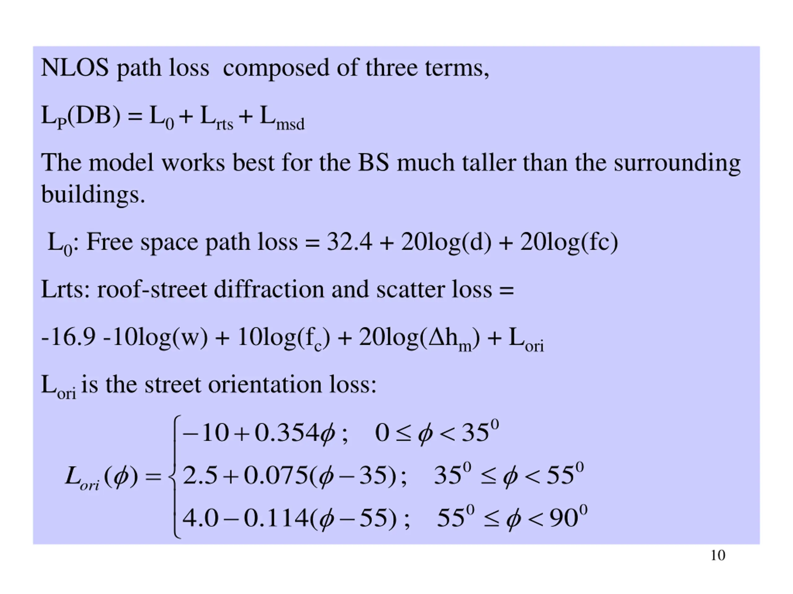 For LOS case, Lm(db) = 42.6 +26log(d) + 20log(fc); d 20m For NLOS case, we have to consider, Hroof = Height of roof-top hBS = hBS - hroof hMS = hroof - hMS w: width of street in meter b: Building separation in meter along the radio path : Road orientation w.r.t. the direction of radio propagation in degrees incident angle relative to the street). 9