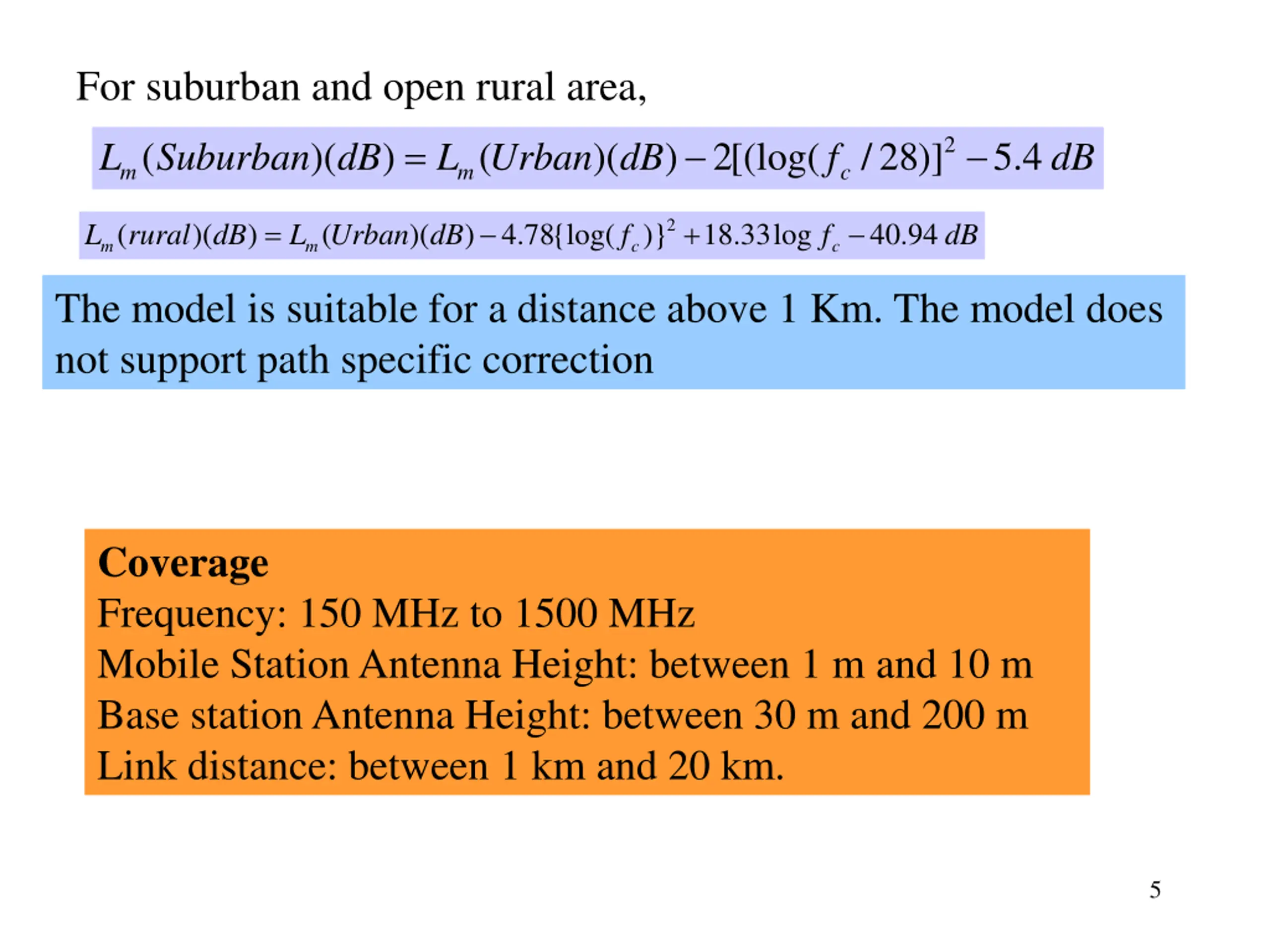 Empirical formulation of data provided by the Okumura model and is valid for frequencies in the range 150MHz- 1500MHz = + ( )( ) 69 55 . 26 16 . (log ) 13 82 . (log ) ( ) L + Urban 9 . 44 dB 55 f h a h m ( c BS MS . 6 log ) log h d BS For large city, 2 . 8 29 (log . 1 54 ) 1 . 1 ; 300 h dB for f MHz MS c = ( ) a h MS 2 2 . 3 (log 11 75 . ) 9 . 4 ; 300 h dB for f MHz MS c For small and medium city, = ) 7 . 0 . 1 ( ) 8 . 0 ( ) 1 . 1 ( log 56 log a h f h f dB MS c MS c 4