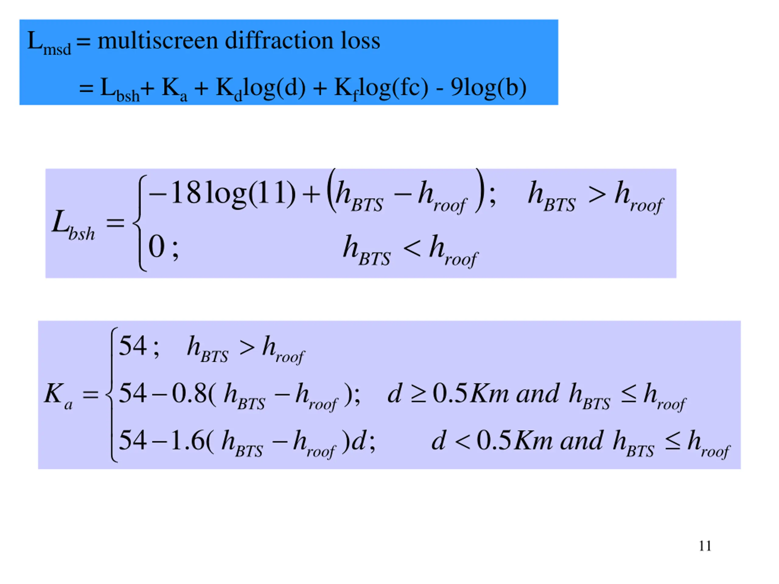 Lmsd = multiscreen diffraction loss = Lbsh+ Ka + Kdlog(d) + Kflog(fc) - 9log(b) ( ) + 18 log( 11 ) ; BTS h roof h BTS h roof h = L bsh 0 ; BTS h roof h 54 ; BTS h ( 8 . 0 roof h = 54 ); 5 . 0 K BTS h roof h d Km and BTS h roof h a 54 ( 6 . 1 ) ; 5 . 0 BTS h roof h d d Km and BTS h roof h 11