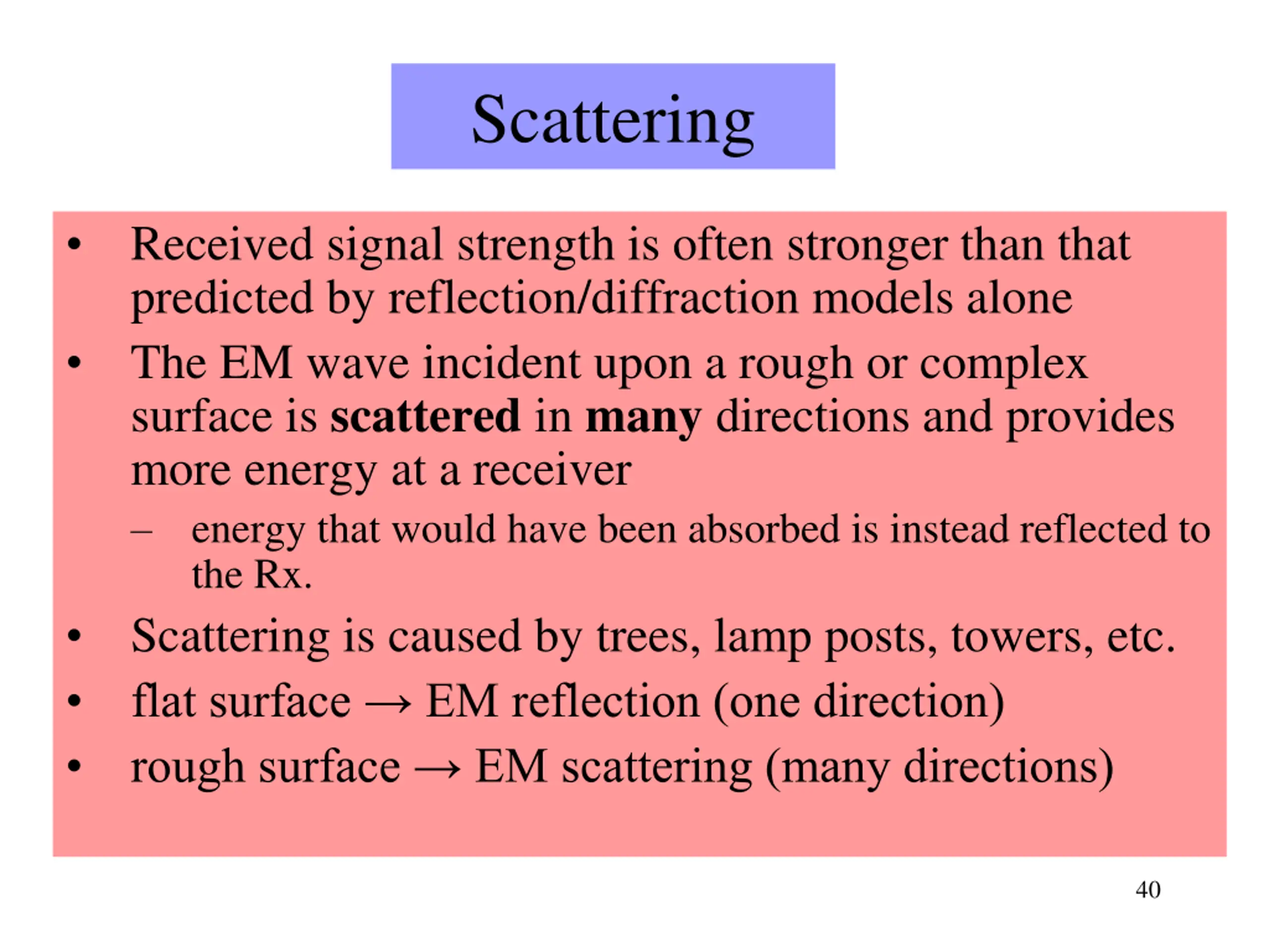 Scattering Received signal strength is often strongerthan that predicted by reflection/diffraction models alone The EM wave incident upon a rough or complex surface is scattered in many directions and provides more energy at a receiver energy that would have been absorbed is instead reflected to the Rx. Scattering is caused by trees, lamp posts, towers, etc. flat surface EM reflection (one direction) rough surface EM scattering (many directions) 40