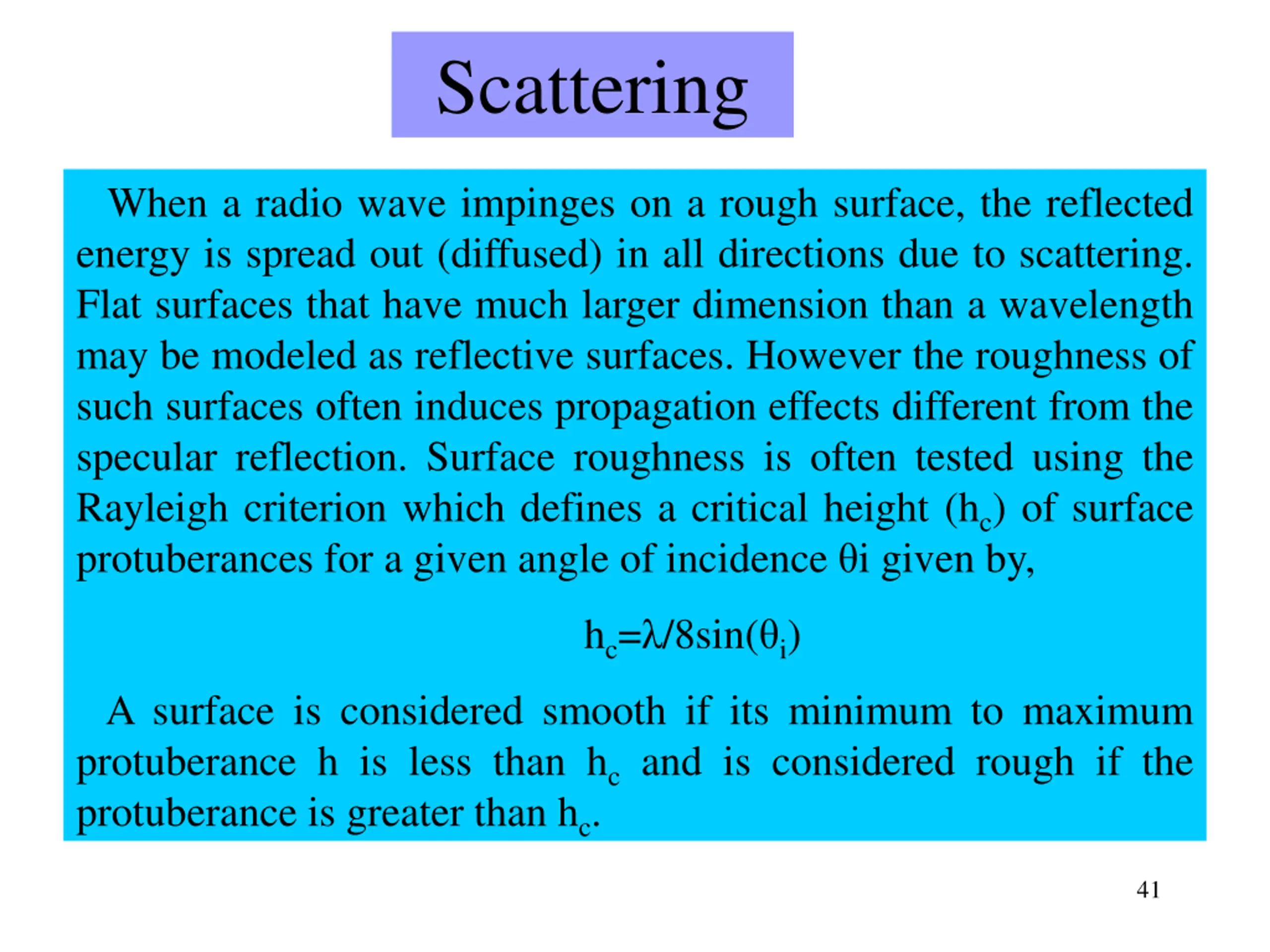 Scattering When a radio wave impinges on a rough surface, the reflected energy is spread out (diffused) in all directions due to scattering. Flat surfaces that have much larger dimension than a wavelength may be modeled as reflective surfaces. However the roughness of such surfaces often induces propagation effects different from the specular reflection. Surface roughness is often tested using the Rayleigh criterion which defines a critical height (hc) of surface protuberances for a given angle of incidence i given by, hc= /8sin( i) A surface is considered smooth if its minimum to maximum protuberance h is less than hc and is considered rough if the protuberance is greater than hc. 41