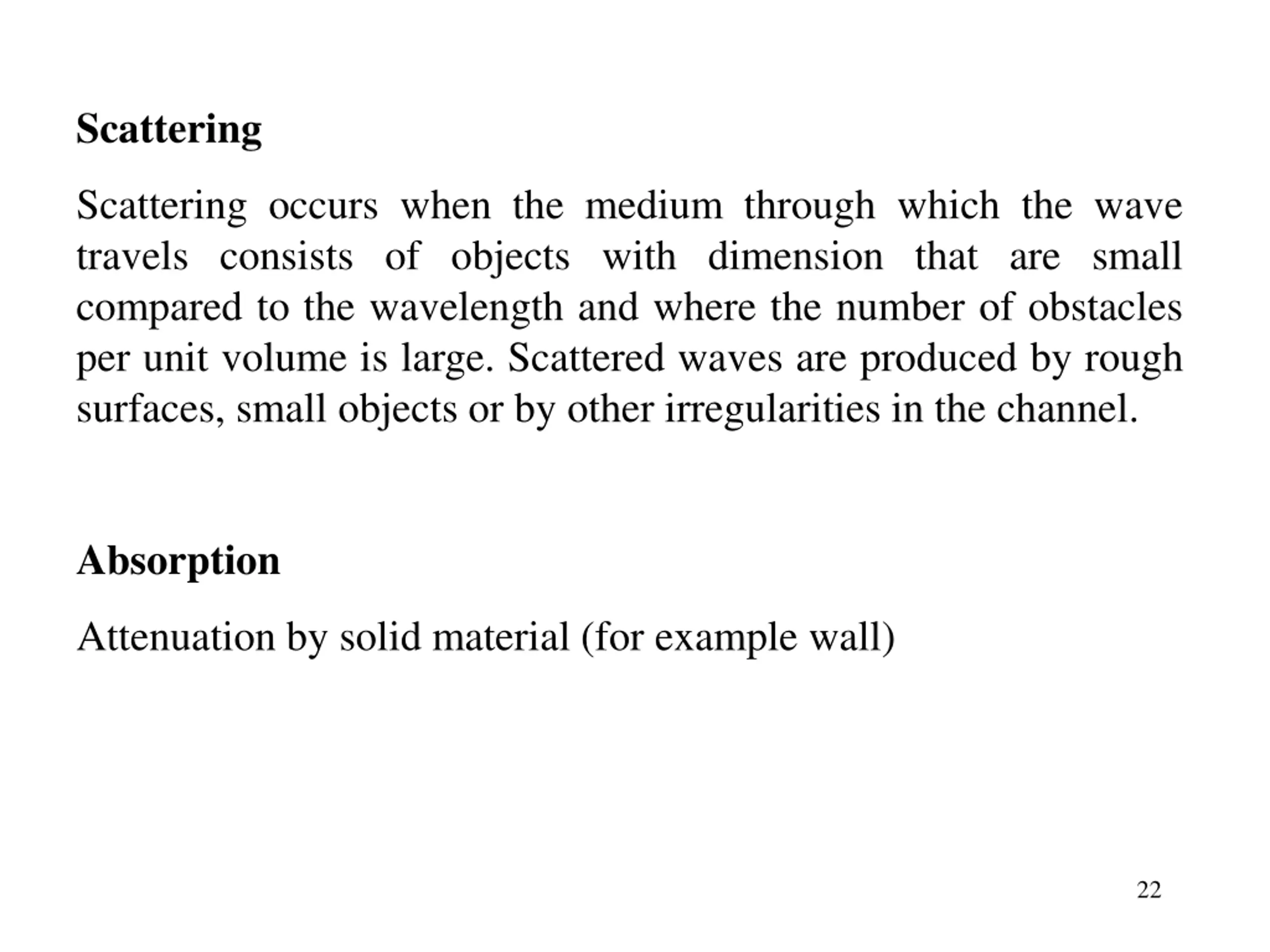 Scattering Scattering occurs when the medium through which the wave travels consists of objects with dimension that are small compared to the wavelength and where the number of obstacles per unit volume is large. Scattered waves are produced by rough surfaces, small objects or by other irregularities in the channel. Absorption Attenuation by solid material (for example wall) 22