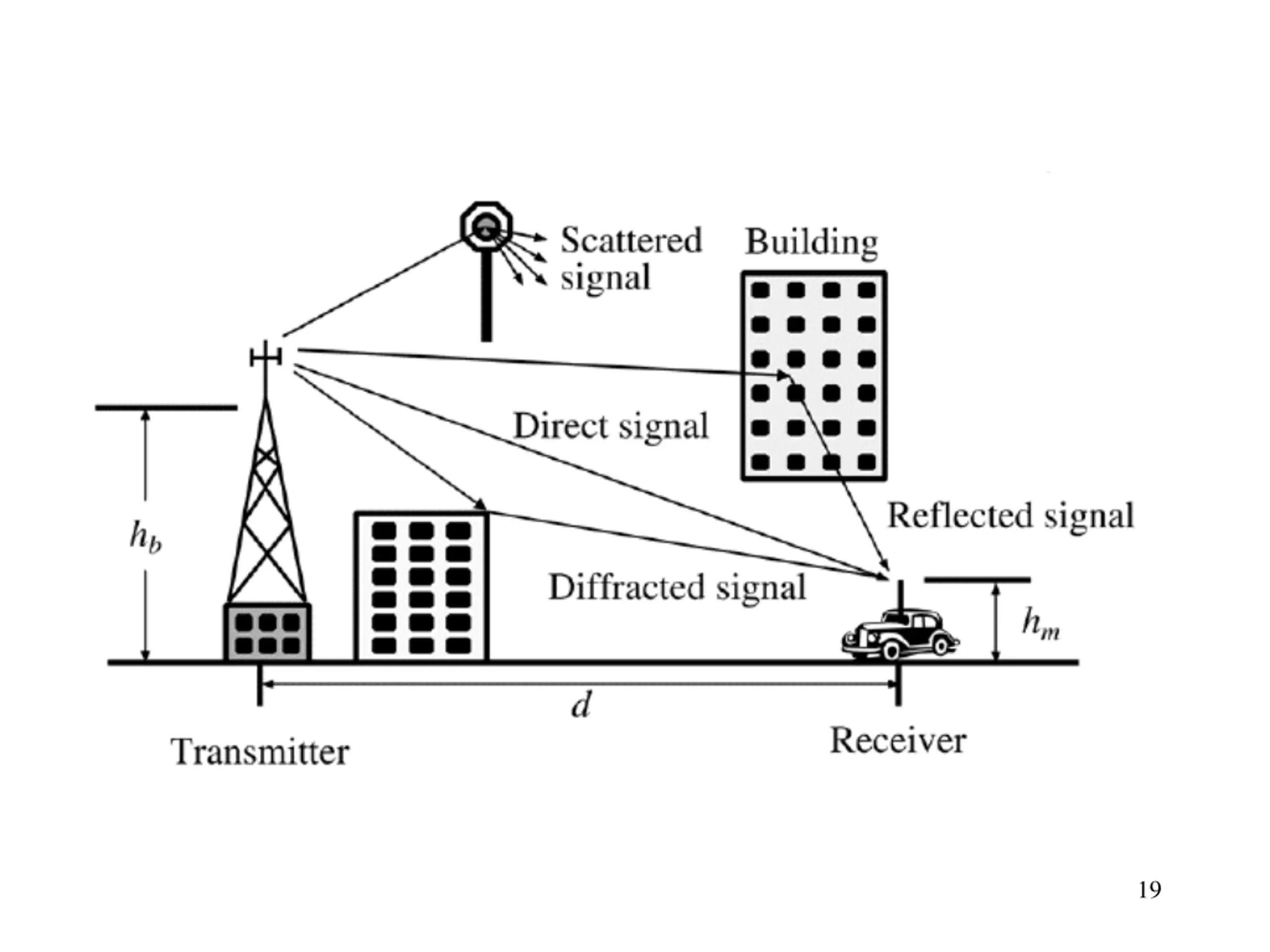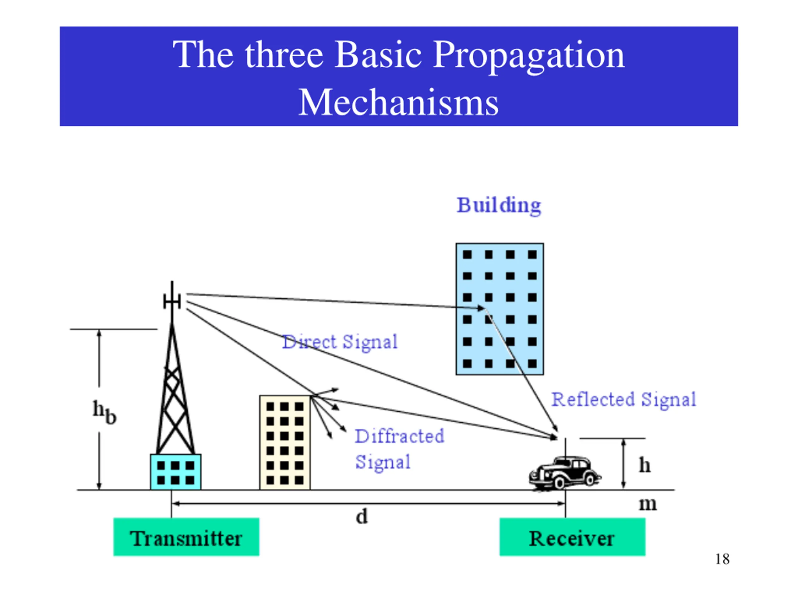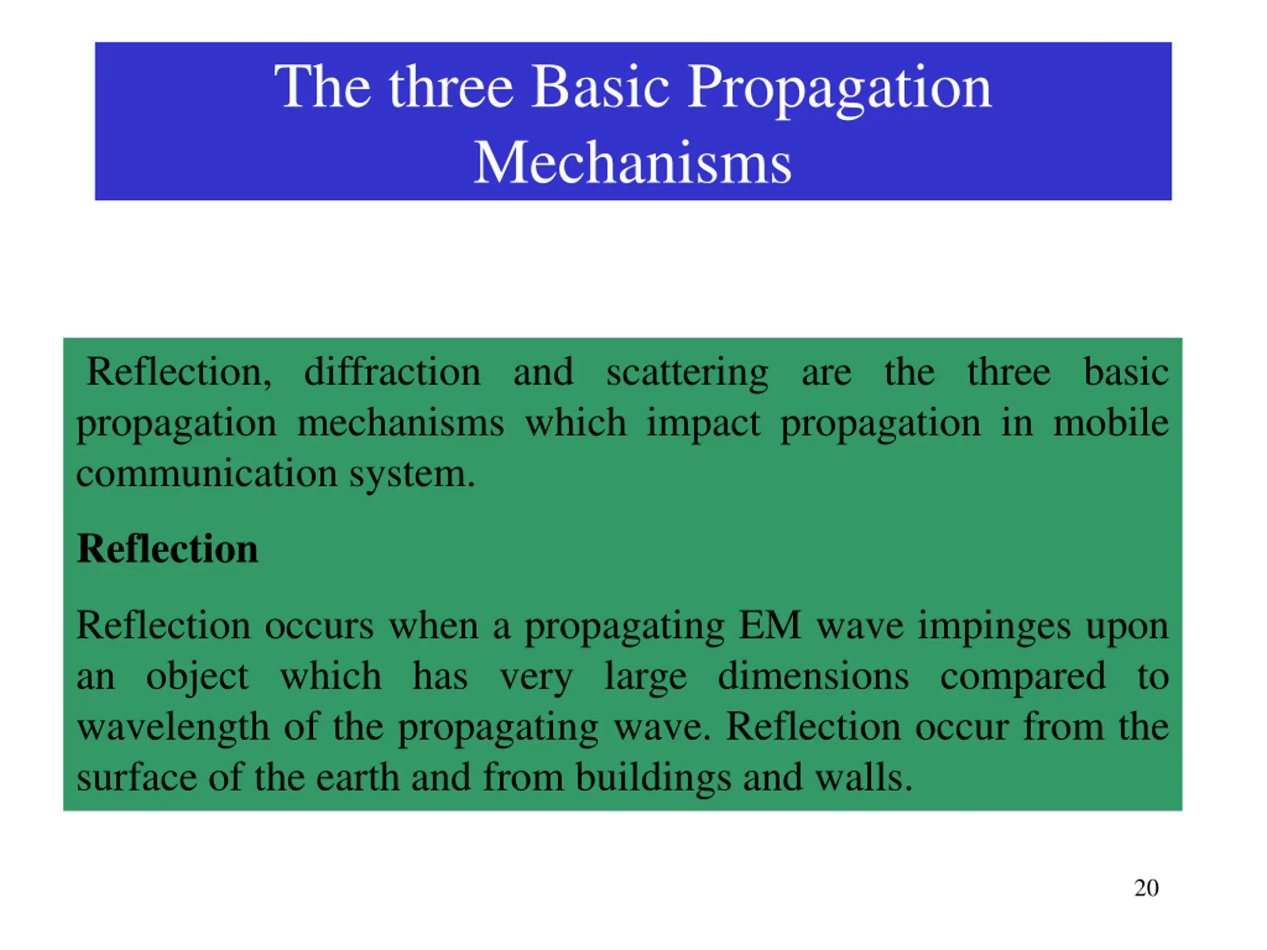 The three Basic Propagation Mechanisms Reflection, diffraction and scattering are the three basic propagation mechanisms which impact propagation in mobile communication system. Reflection Reflection occurs when a propagating EM wave impinges upon an object which has very large dimensions compared to wavelength of the propagating wave. Reflection occur from the surface of the earth and from buildings and walls. 20