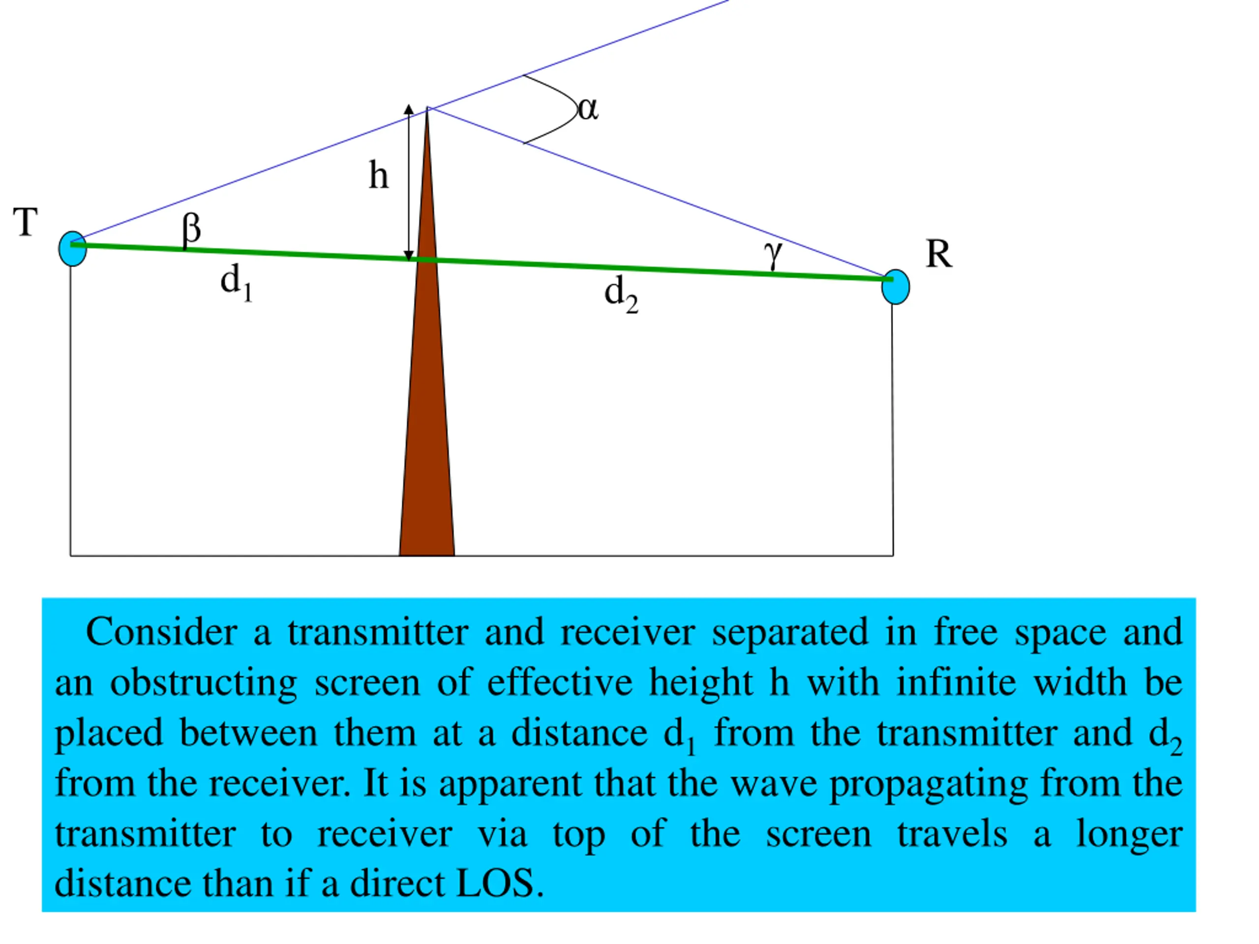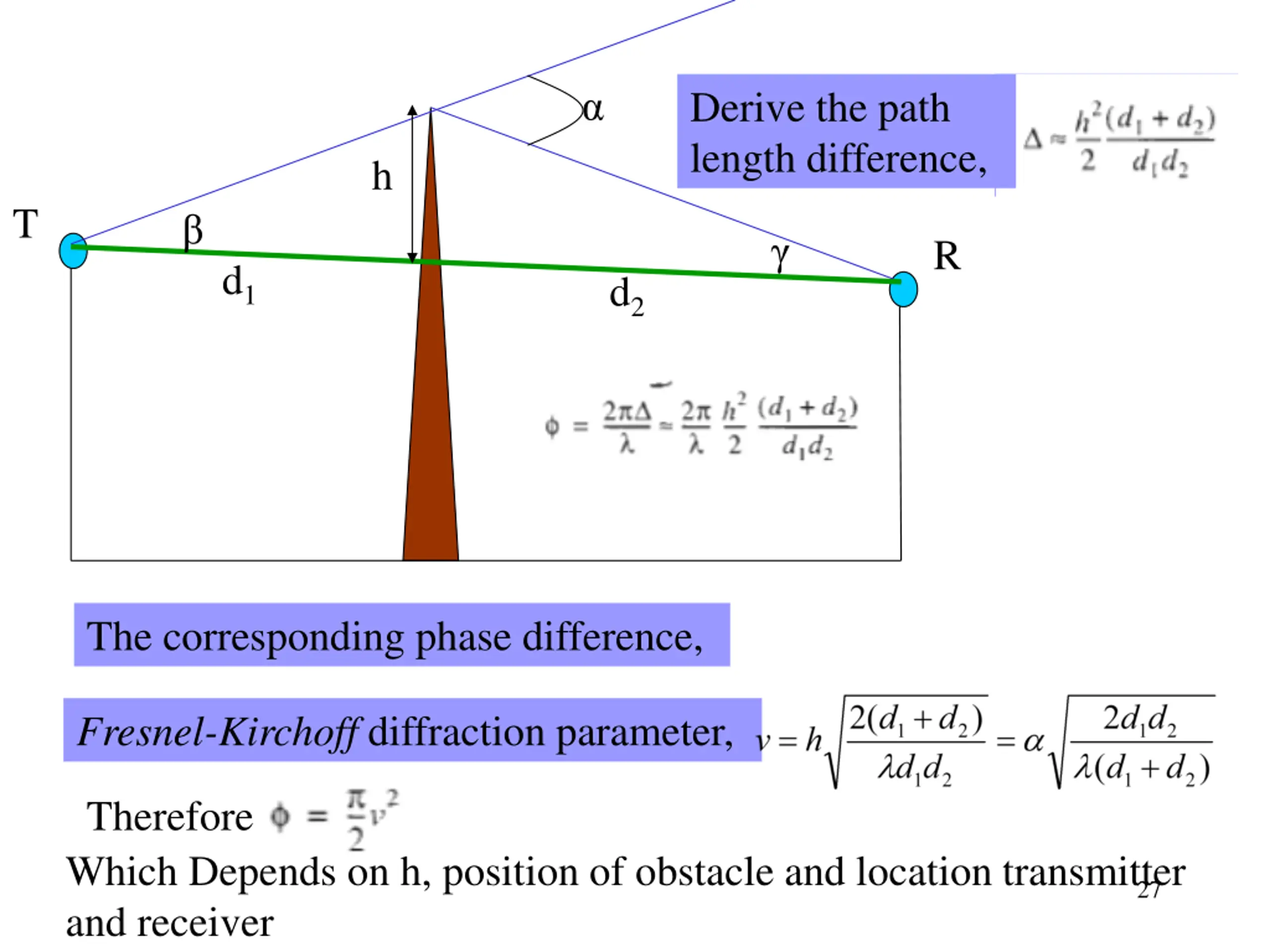 h T R d1 d2 Consider a transmitter and receiver separated in free space and an obstructing screen of effective height h with infinite width be placed between them at a distance d1 from the transmitter and d2 from the receiver. It is apparent that the wave propagating from the transmitter to receiver via top of the screen travels a longer distance than if a direct LOS. 26