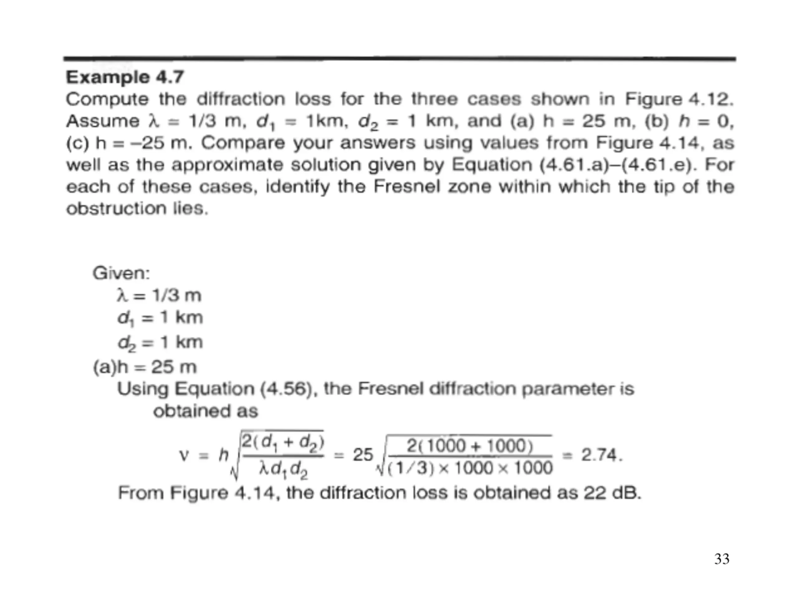 Fresnel zones under different knife-edge diffraction scenarios h d1 d2 h d1 d2 and v are positive since h is positive and v are 0 since h is 0 h A family of ellipsoids can be constructed between transmitter and receiver by joining all points for which the excess path delay is an integral multiple of /2. represent Fresnel zones. d1 d2 The ellipsoids and v are negative since h is negative 32