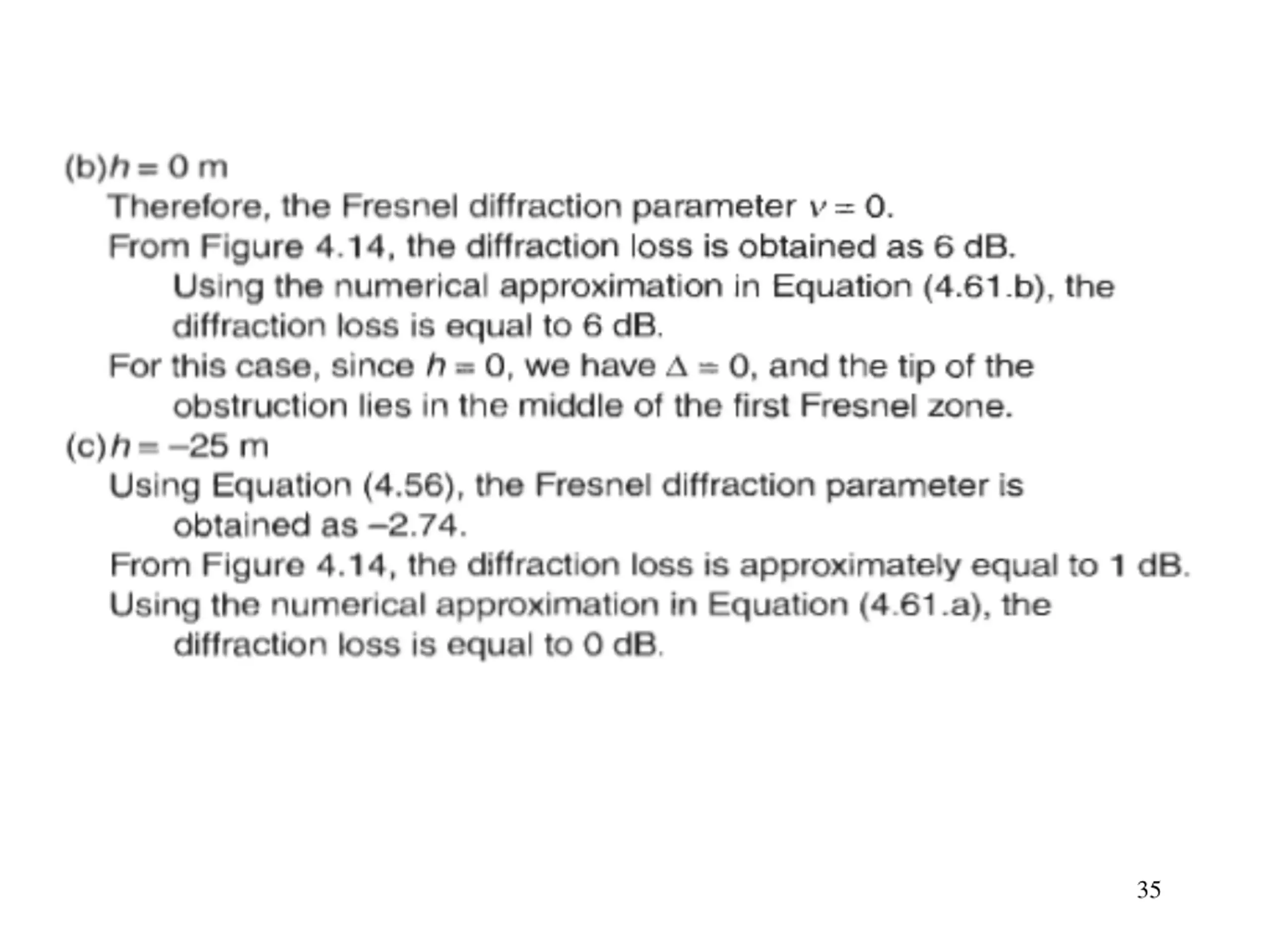 Now Fresnel-Kirchoff diffraction parameter, 2 10000 2000 + = = 0424 . 0 . 4 24 v / 1 ( ) 3 10000 ( 2000 ) The diffraction gain due to the presence of a knife edge, . 0 225 . 0 225 = = = ( ) 20 log 20 log 25 5 . Gd dB dB . 4 24 v ii) For 6dB diffraction loss, v = 0, + d ( 2 ) d d = = 1 d 2 0 v h 1 2 = 38 0 h