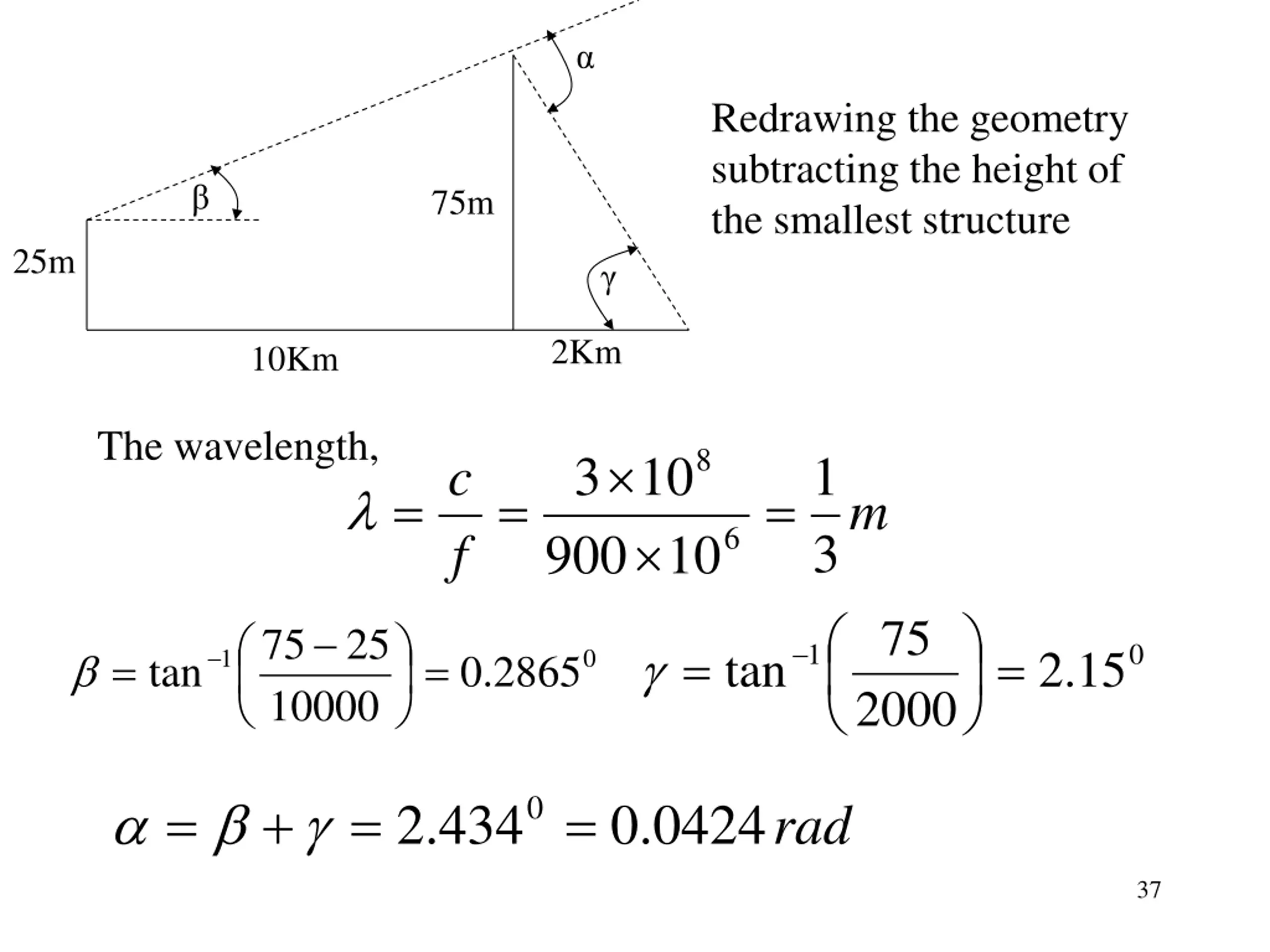 Redrawing the geometry subtracting the height of the smallest structure 75m 25m 2Km 10Km The wavelength, 8 3 10 1 c = = = m 6 3 f 900 10 75 75 25 = = 1 0 tan . 2 15 = = 1 0 tan 2865 . 0 2000 10000 = + = 0= . 2 434 0424 . 0 rad 37