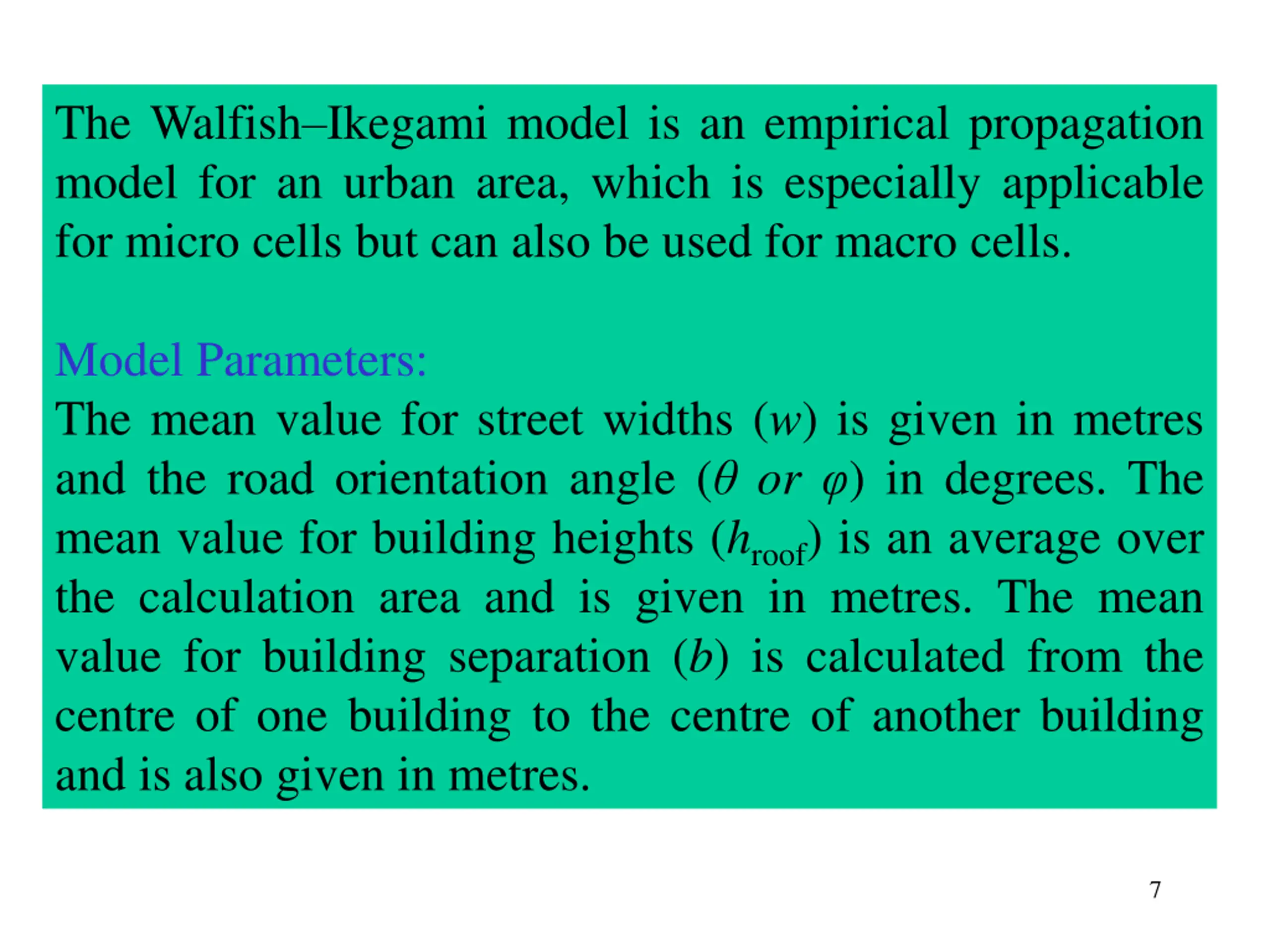 The WalfishIkegami model is an empirical propagation model for an urban area, which is especially applicable for micro cells but can also be used for macro cells. Model Parameters: The mean value for street widths (w) is given in metres and the road orientation angle ( or ) in degrees. The mean value for building heights (hroof) is an average over the calculation area and is given in metres. The mean value for building separation (b) is calculated from the centre of one building to the centre of another building and is also given in metres. 7