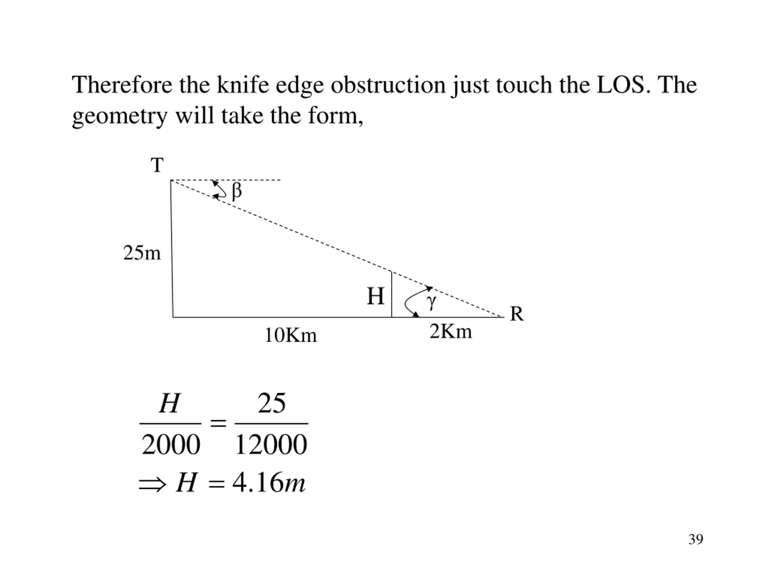 Therefore the knife edge obstruction just touch the LOS. The geometry will take the form, T 25m H 2Km R 10Km 25 H = 2000 12000 = . 4 16 H m 39
