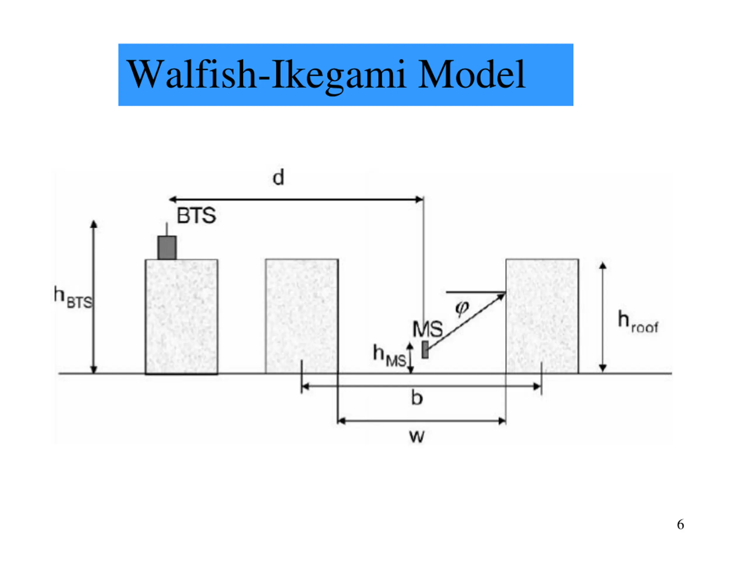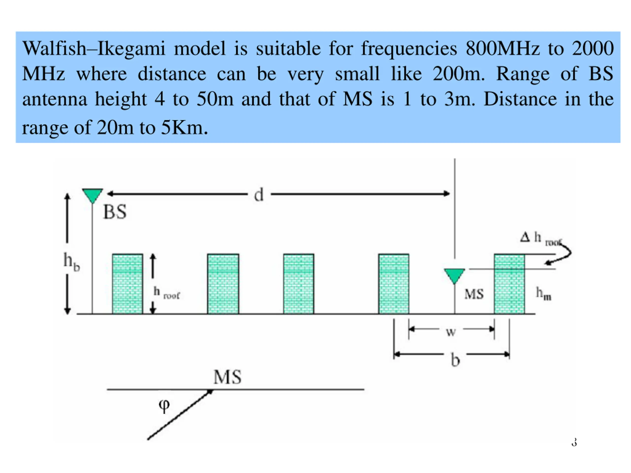 WalfishIkegami model is suitable for frequencies 800MHz to 2000 MHz where distance can be very small like 200m. Range of BS antenna height 4 to 50m and that of MS is 1 to 3m. Distance in the range of 20m to 5Km. 8