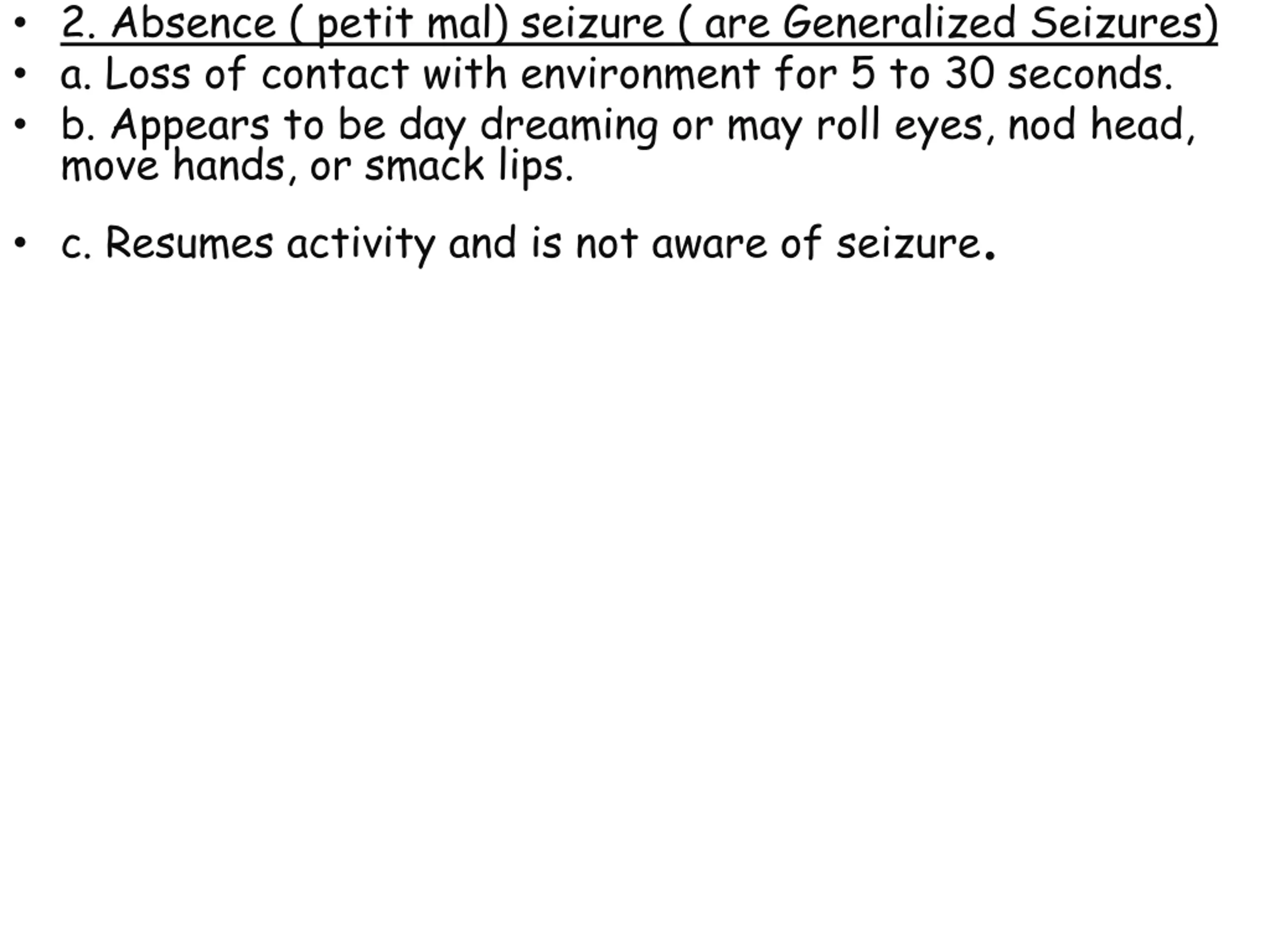 2. Absence ( petit mal) seizure ( are Generalized Seizures) a. Loss of contact with environment for 5 to 30 seconds. b. Appears to be day dreaming or may roll eyes, nod head, move hands, or smack lips. c. Resumes activity and is not aware of seizure.