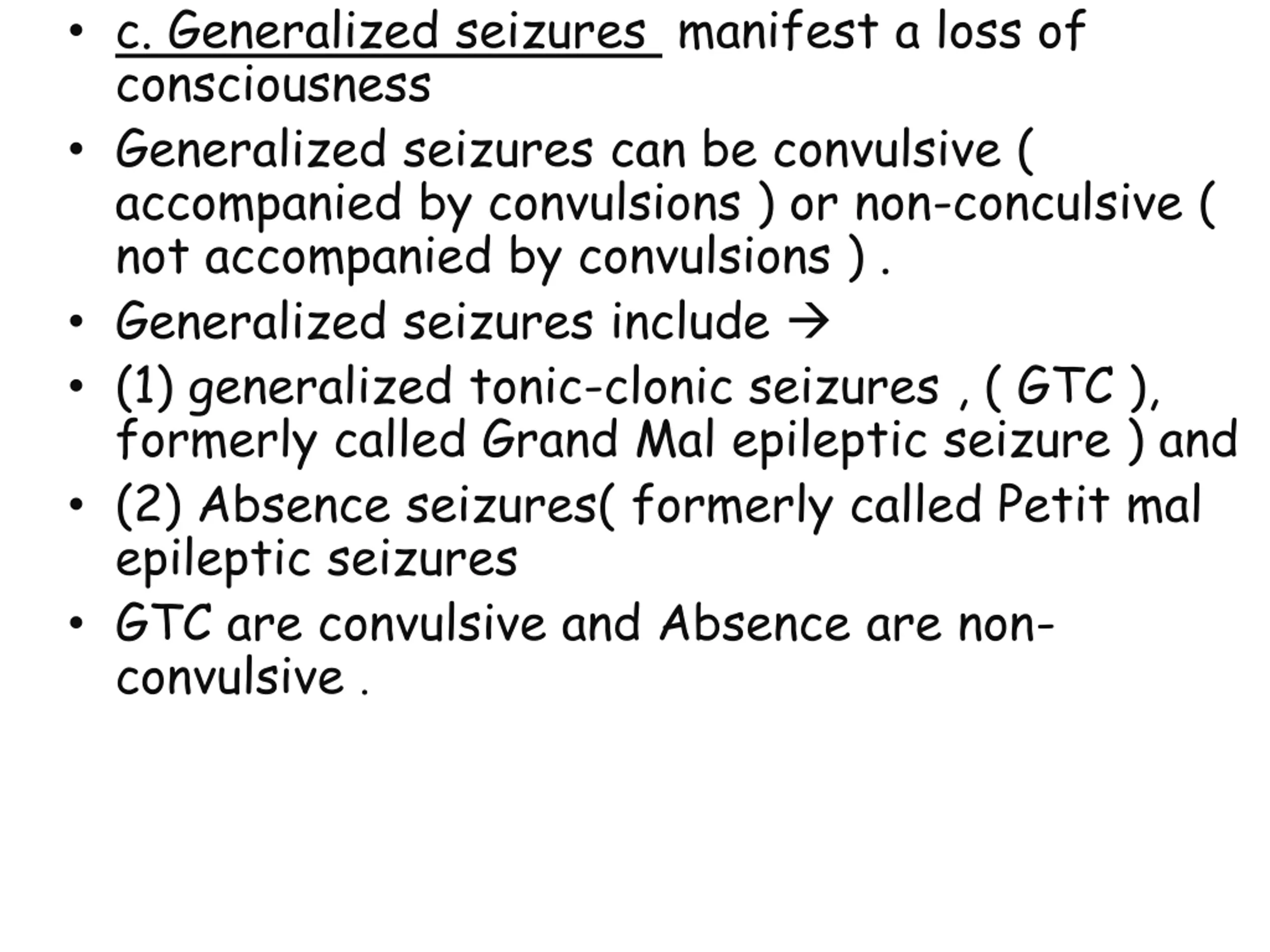 c. Generalized seizures manifest a loss of consciousness Generalized seizures can be convulsive ( accompanied by convulsions ) or non-conculsive ( not accompanied by convulsions ) . Generalized seizures include (1) generalized tonic-clonic seizures , ( GTC ), formerly called Grand Mal epileptic seizure ) and (2) Absence seizures( formerly called Petit mal epileptic seizures GTC are convulsive and Absence are non- convulsive .