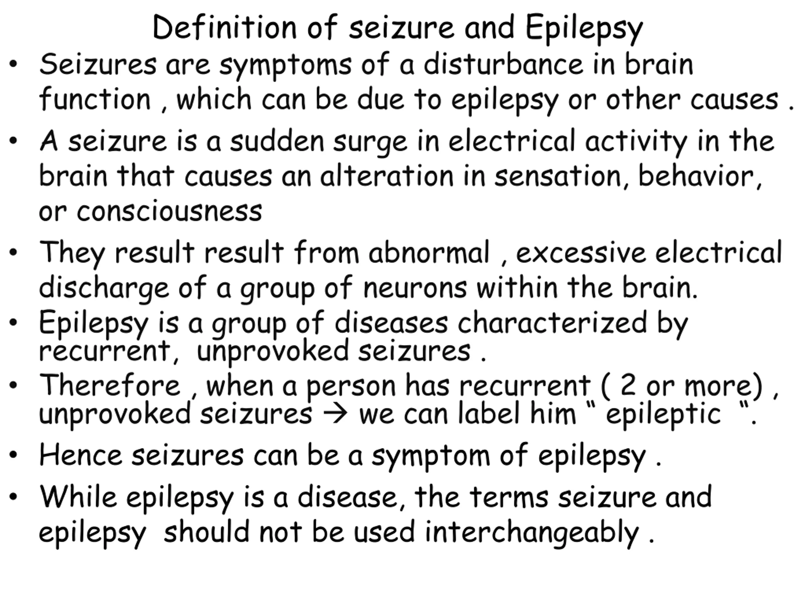 Definition of seizure and Epilepsy Seizures are symptoms of a disturbance in brain function , which can be due to epilepsy or other causes . A seizure is a sudden surge in electrical activity in the brain that causes an alteration in sensation, behavior, or consciousness They result result from abnormal , excessive electrical discharge of a group of neurons within the brain. Epilepsy is a group of diseases characterized by recurrent, unprovoked seizures . Therefore , when a person has recurrent ( 2 or more) , unprovoked seizures we can label him epileptic . Hence seizures can be a symptom of epilepsy . While epilepsy is a disease, the terms seizure and epilepsy should not be used interchangeably .
