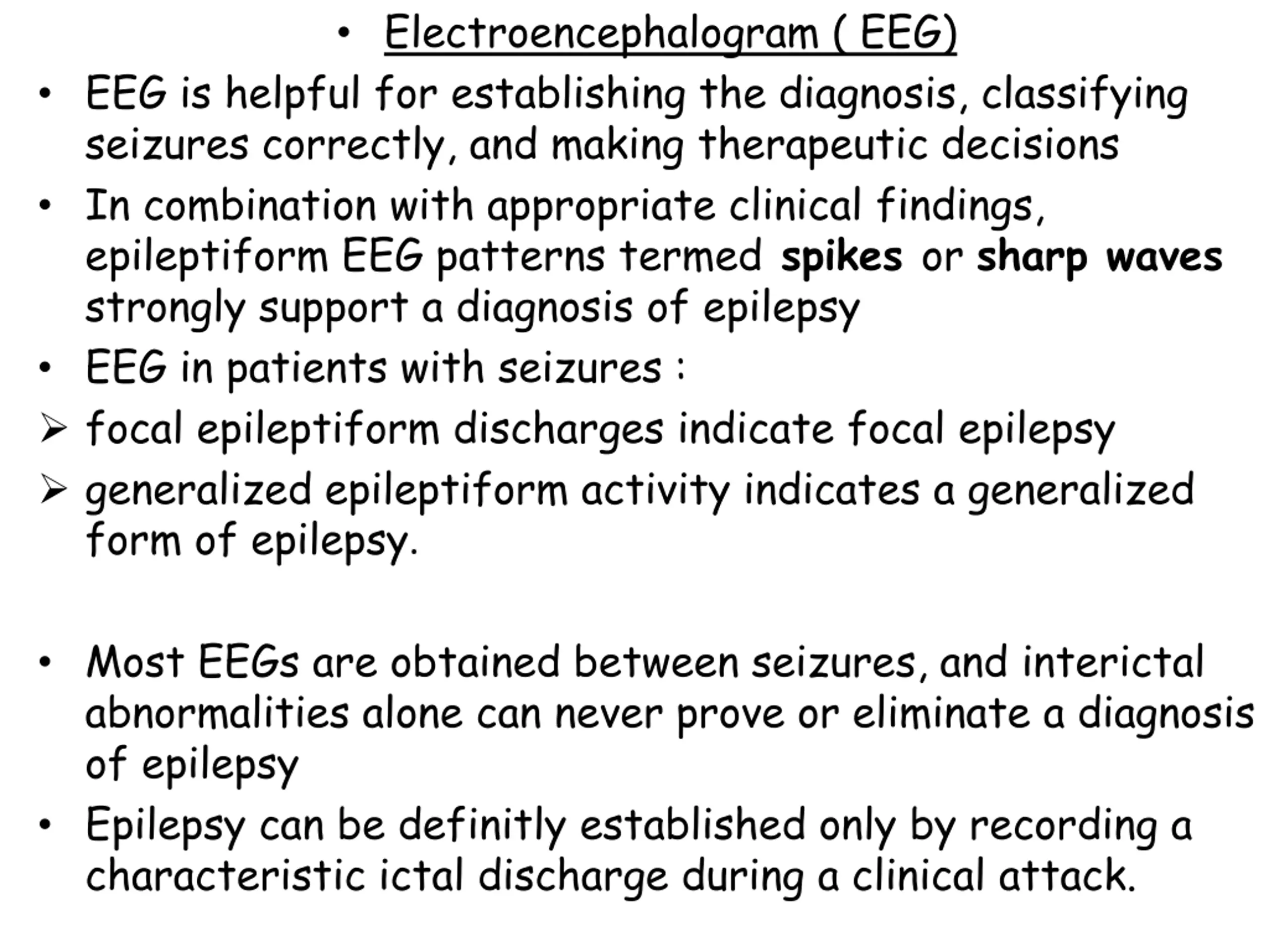 Electroencephalogram ( EEG) EEG is helpful for establishing the diagnosis, classifying seizures correctly, and making therapeutic decisions In combination with appropriate clinical findings, epileptiform EEG patterns termed spikes or sharp waves strongly support a diagnosis of epilepsy EEG in patients with seizures : focal epileptiform discharges indicate focal epilepsy generalized epileptiform activity indicates a generalized form of epilepsy. Most EEGs are obtained between seizures, and interictal abnormalities alone can never prove or eliminate a diagnosis of epilepsy Epilepsy can be definitly established only by recording a characteristic ictal discharge during a clinical attack.
