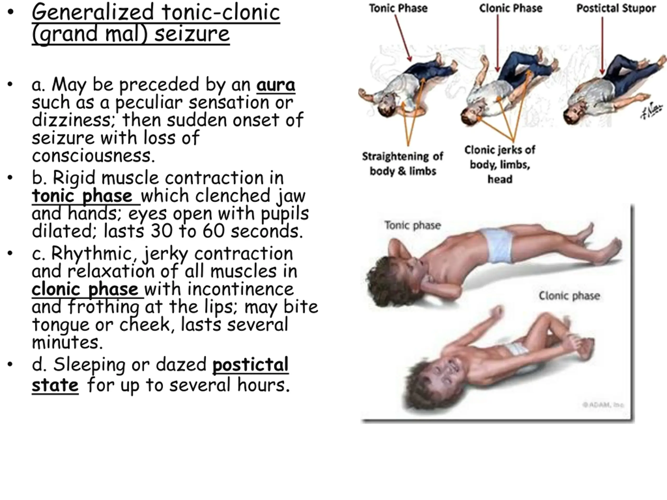 Generalized tonic-clonic (grand mal) seizure a. May be preceded by an aura such as a peculiar sensation or dizziness; then sudden onset of seizure with loss of consciousness. b. Rigid muscle contraction in tonic phase which clenched jaw and hands; eyes open with pupils dilated; lasts 30 to 60 seconds. c. Rhythmic, jerky contraction and relaxation of all muscles in clonic phase with incontinence and frothing at the lips; may bite tongue or cheek, lasts several minutes. d. Sleeping or dazed postictal state for up to several hours. seizure disorders