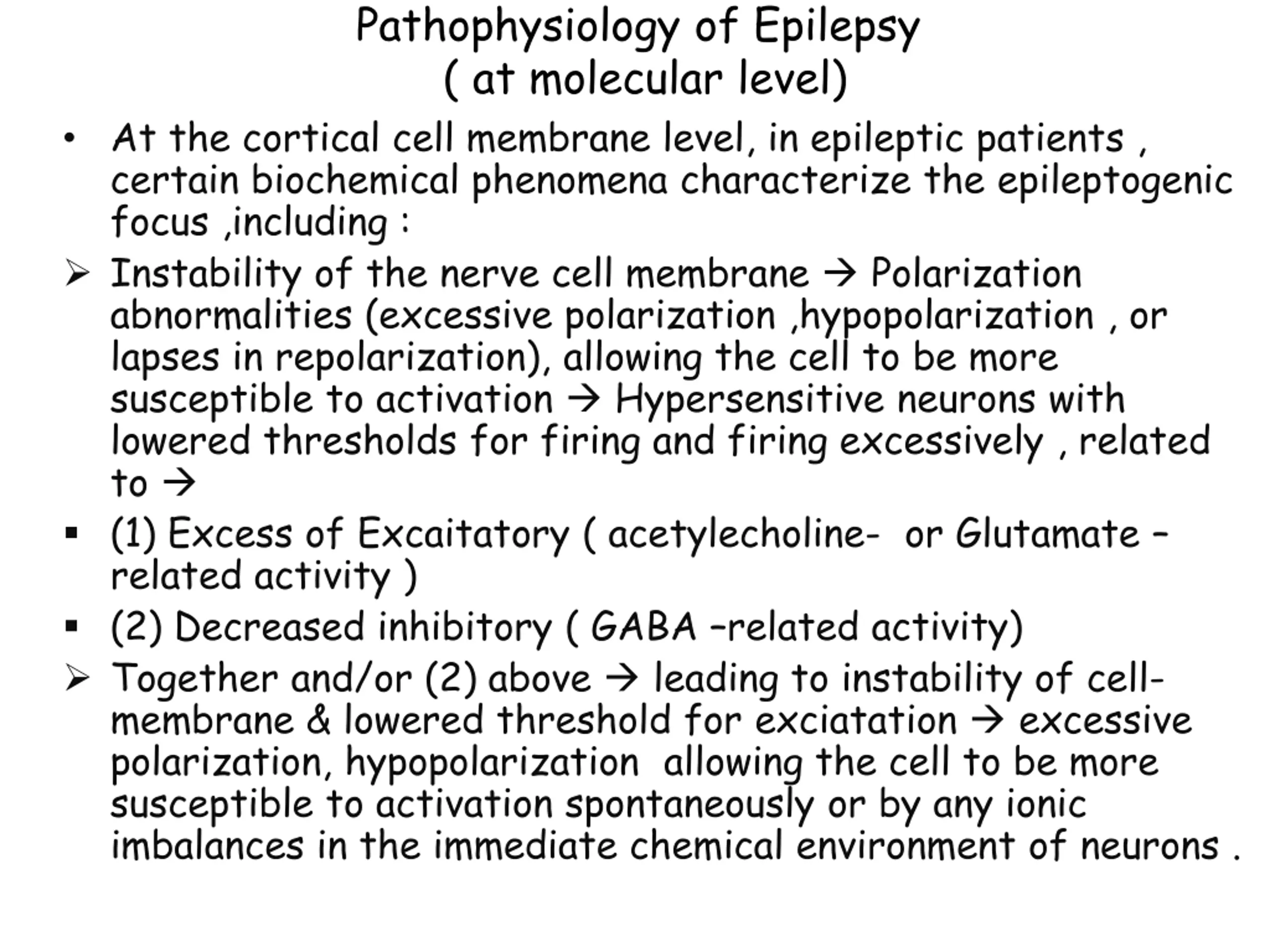 Pathophysiology of Epilepsy ( at molecular level) At the cortical cell membrane level, in epileptic patients , certain biochemical phenomena characterize the epileptogenic focus ,including : Instability of the nerve cell membrane Polarization abnormalities (excessive polarization ,hypopolarization , or lapses in repolarization), allowing the cell to be more susceptible to activation Hypersensitive neurons with lowered thresholds for firing and firing excessively , related to (1) Excess of Excaitatory ( acetylecholine- or Glutamate related activity ) (2) Decreased inhibitory ( GABA related activity) Together and/or (2) above leading to instability of cell- membrane & lowered threshold for exciatation excessive polarization, hypopolarization allowing the cell to be more susceptible to activation spontaneously or by any ionic imbalances in the immediate chemical environment of neurons .