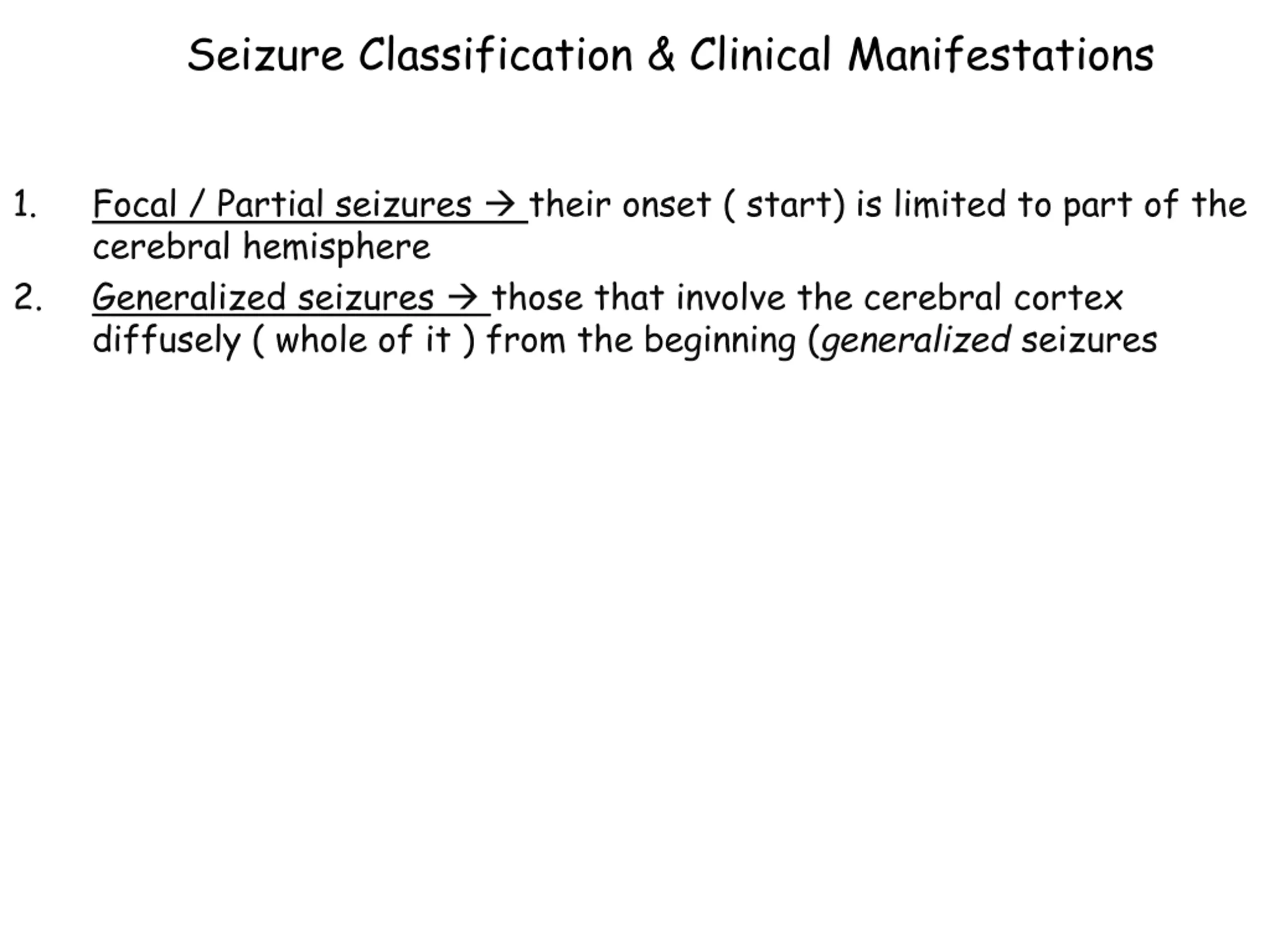 Seizure Classification & Clinical Manifestations 1. Focal / Partial seizures their onset ( start) is limited to part of the cerebral hemisphere Generalized seizures those that involve the cerebral cortex diffusely ( whole of it ) from the beginning (generalized seizures 2.